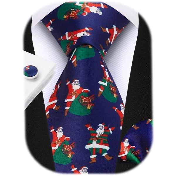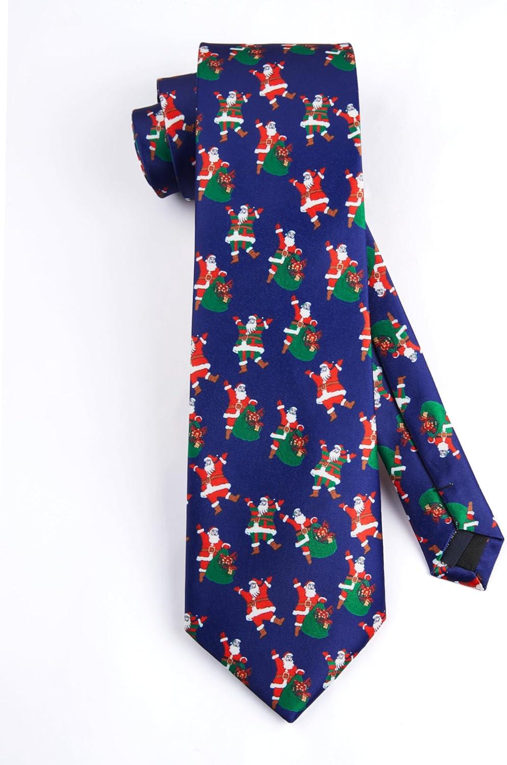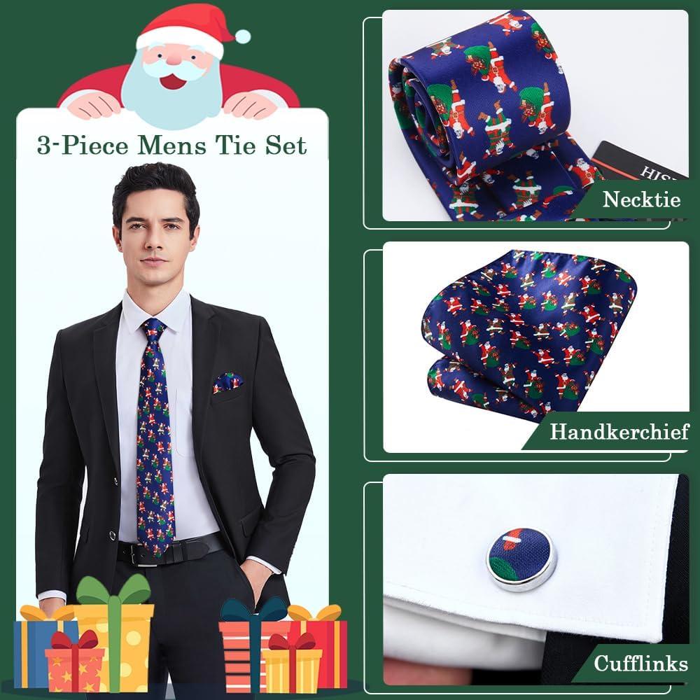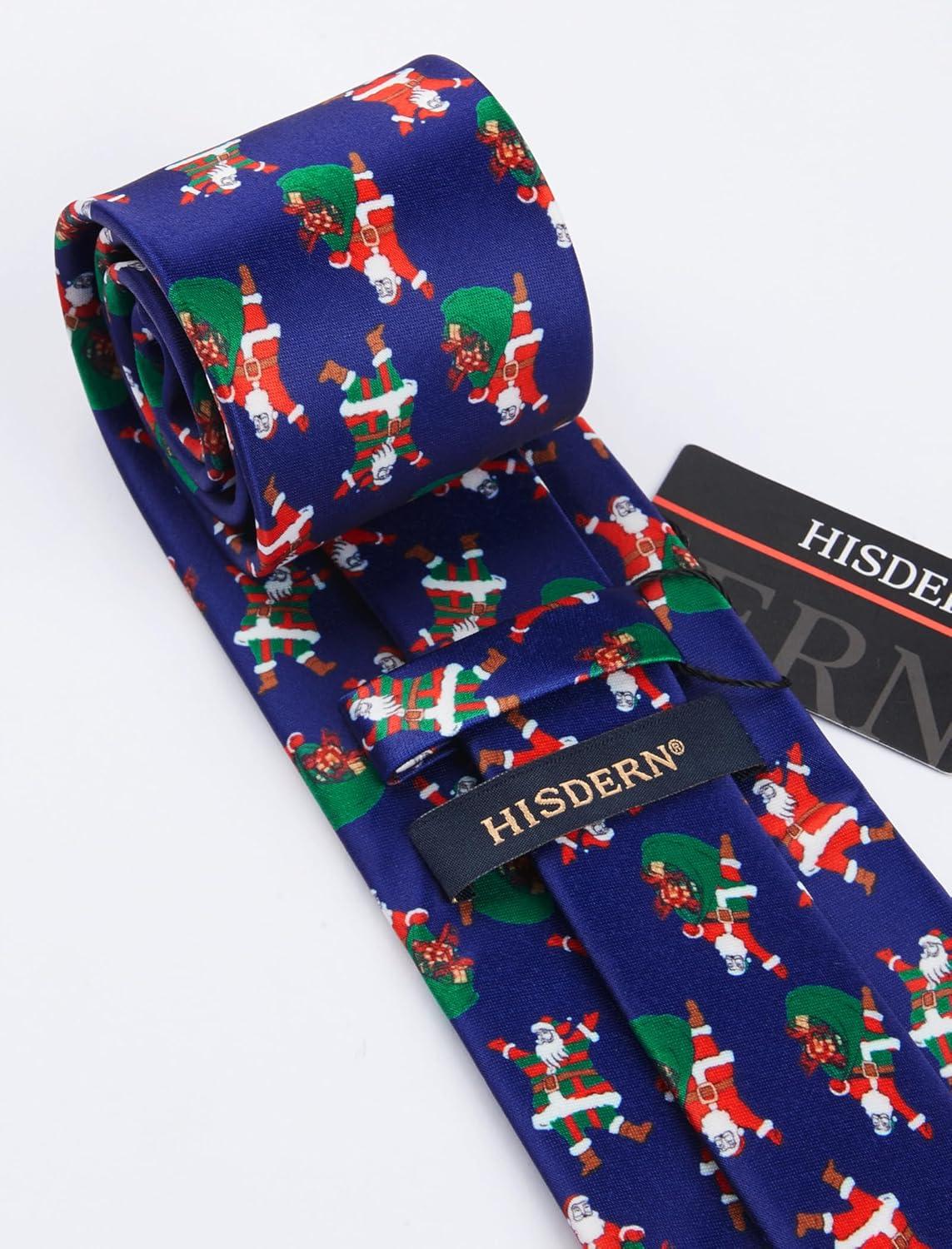 HISDERN Christmas Ties for Men Festival Xmas Silk Necktie Holiday Vocation Funny Tie Pocket Square Cufflinks Set(Navy Blue Santa Claus)