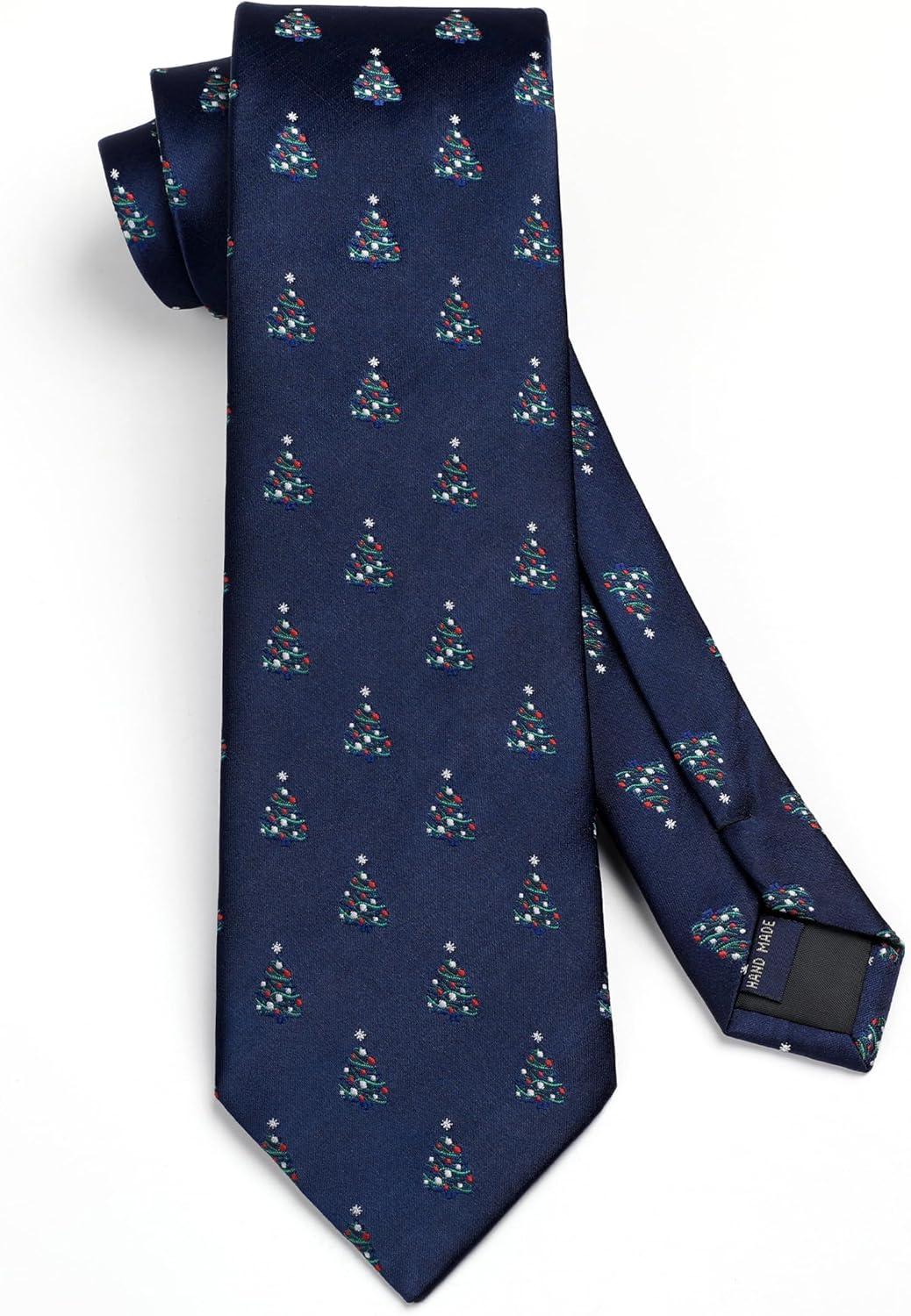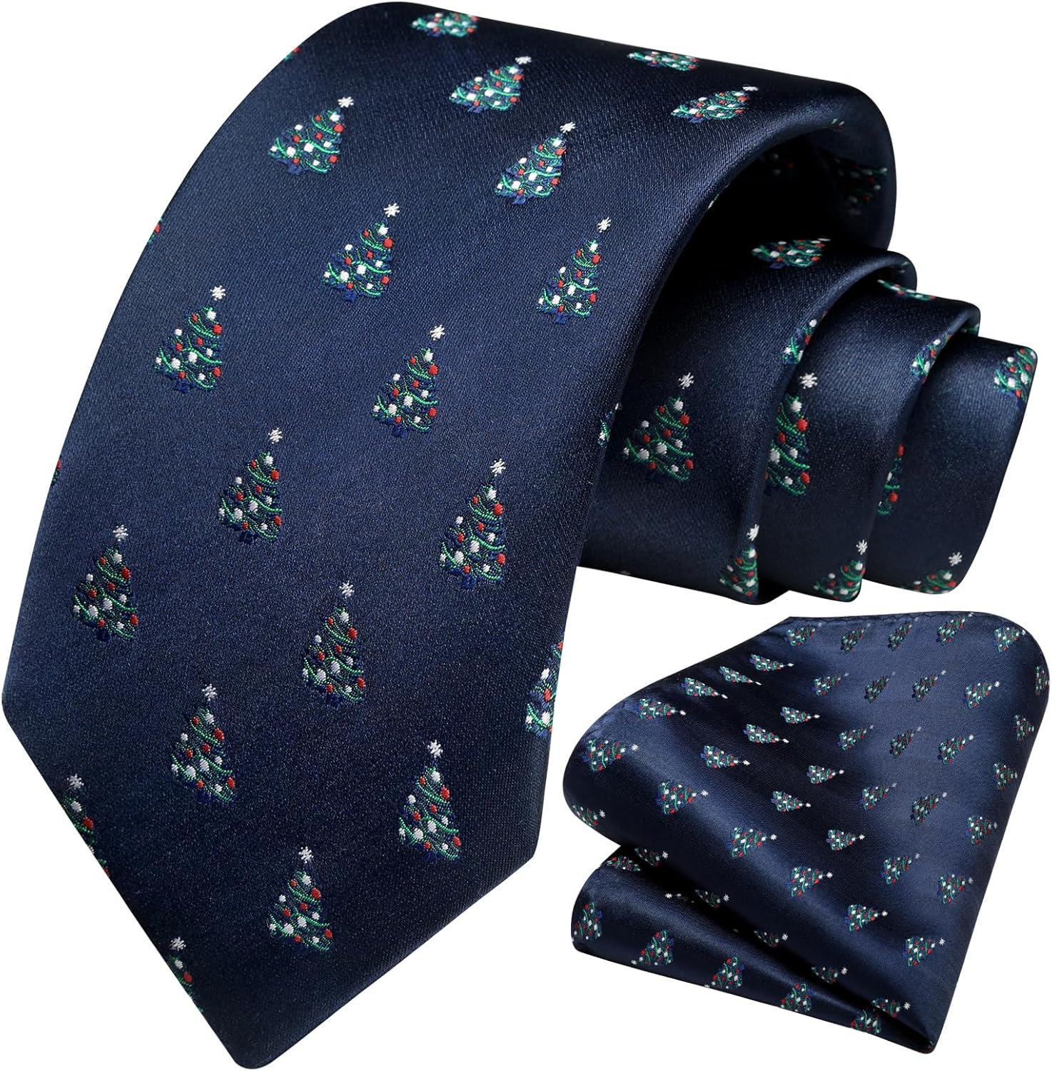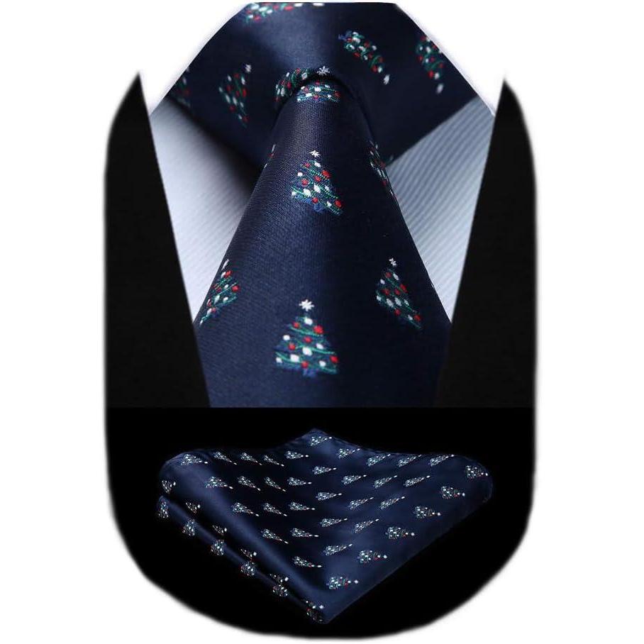 HISDERN Christmas Ties for Men Holiday Festival Funny Tie and Pocket Square Set Vacation Xmas Party Necktie Handkerchief(C-8 Navy / Gift)
