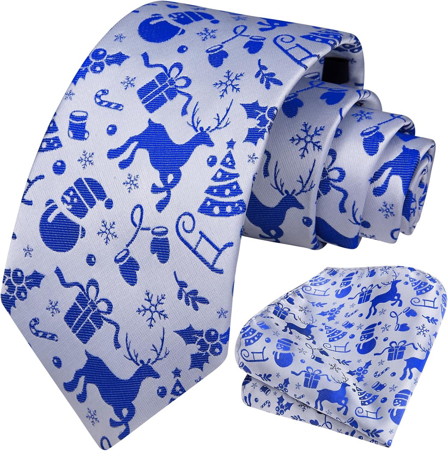 HISDERN Christmas Ties for Men Holiday Festival Funny Tie and Pocket Square Set Vacation Xmas Party Necktie Handkerchief(C-9 Blue / Reindeer)