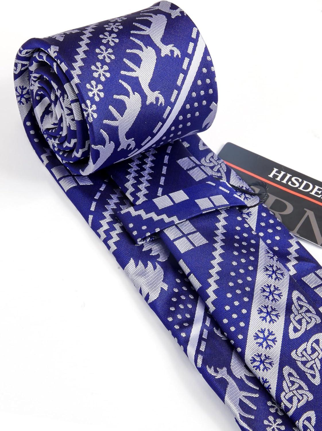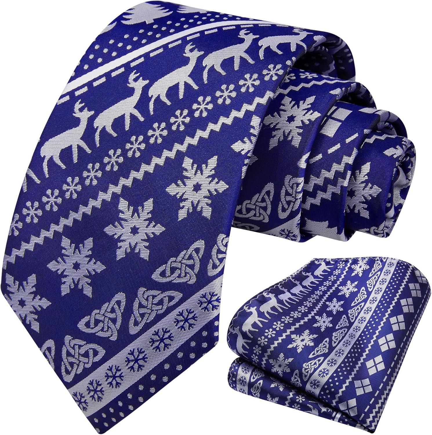 HISDERN Christmas Ties for Men Holiday Festival Funny Tie and Pocket Square Set Vacation Xmas Party Necktie Handkerchief(C-9 Blue / Reindeer)