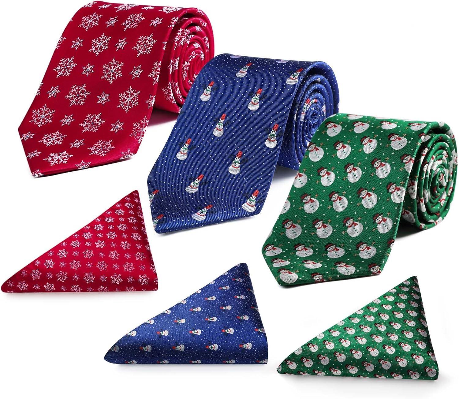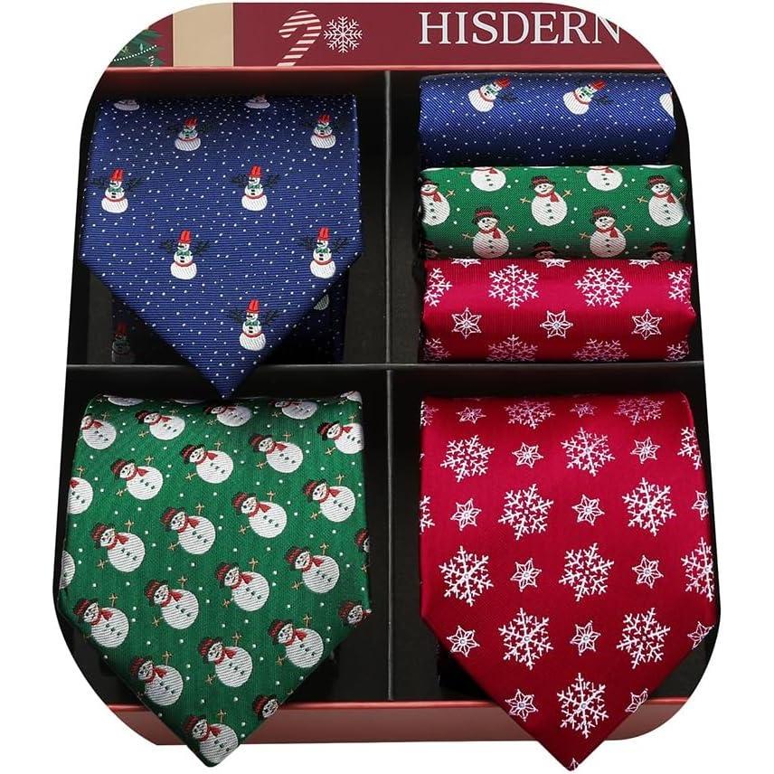 HISDERN Christmas Ties for Men Holiday Tie and Pocket Square Set Lot 3 PCS Tie Pack Gift Box Neckties & Handkerchief(Multicolor)