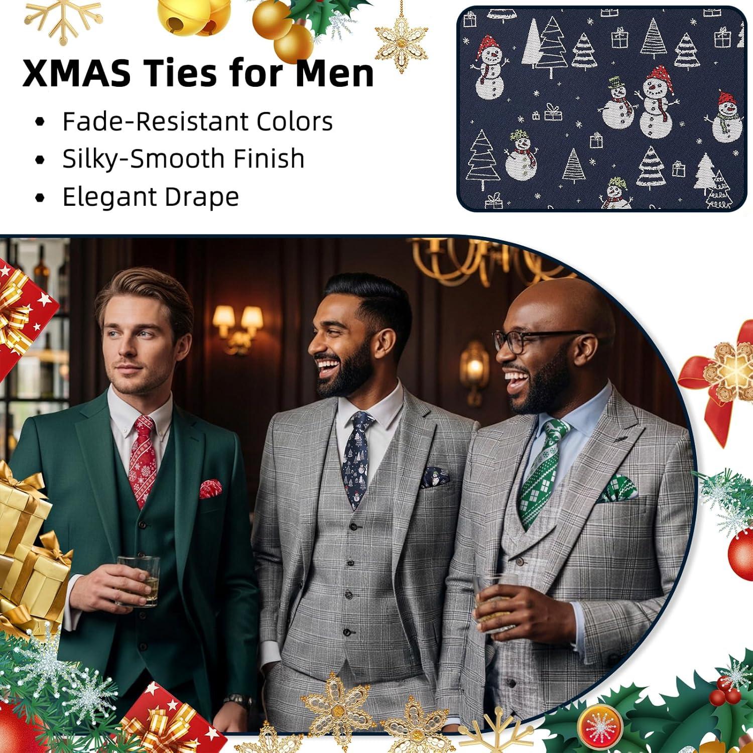 HISDERN Christmas Ties for Men Pre-tied Mens Holiday Silk Tie and Pocket Square Cufflinks Set Xmas Festive Funny Necktie(Festive Blue-snowman/Tree)