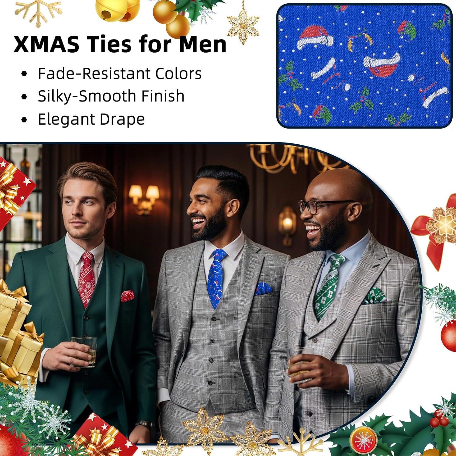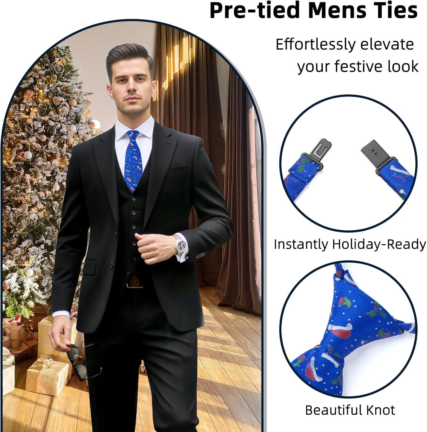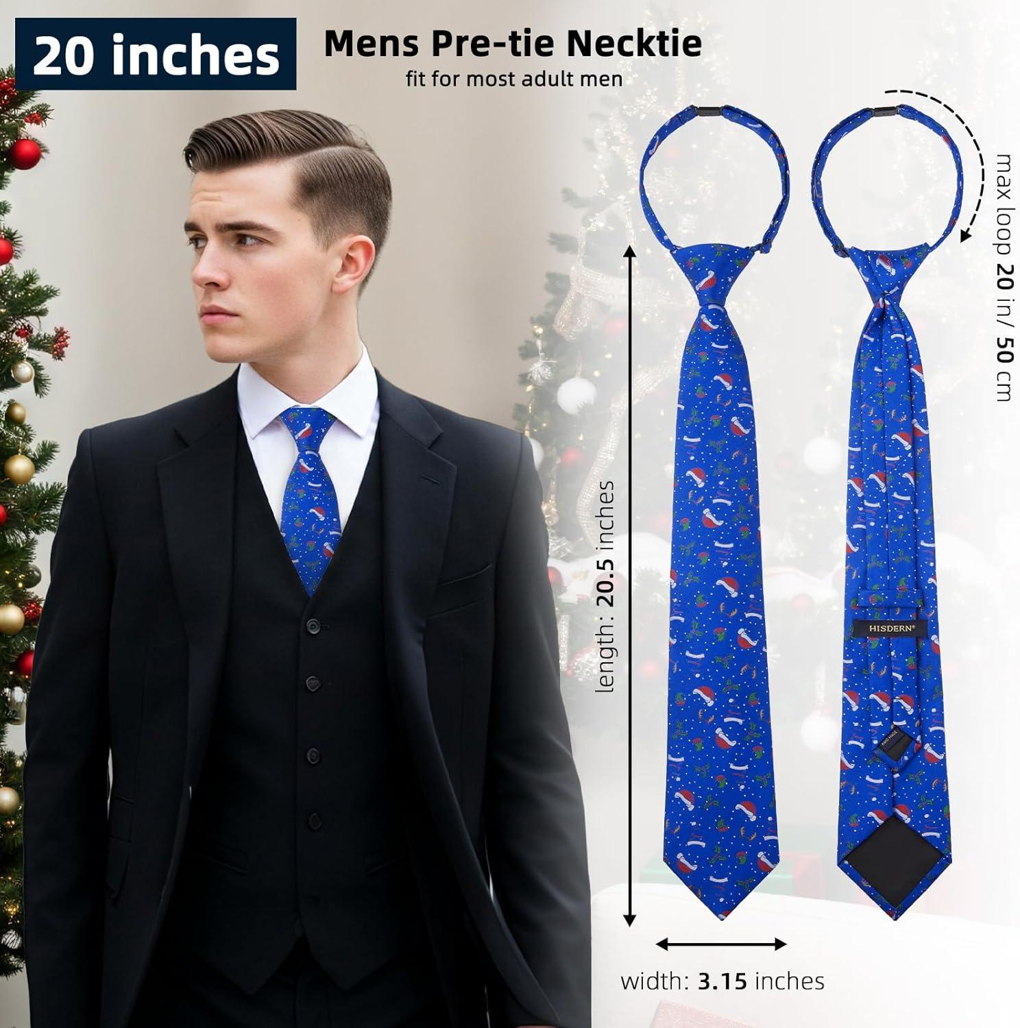 HISDERN Christmas Ties for Men Pre-tied Mens Holiday Silk Tie and Pocket Square Cufflinks Set Xmas Festive Funny Necktie(Festive Blue-xmas Collage)