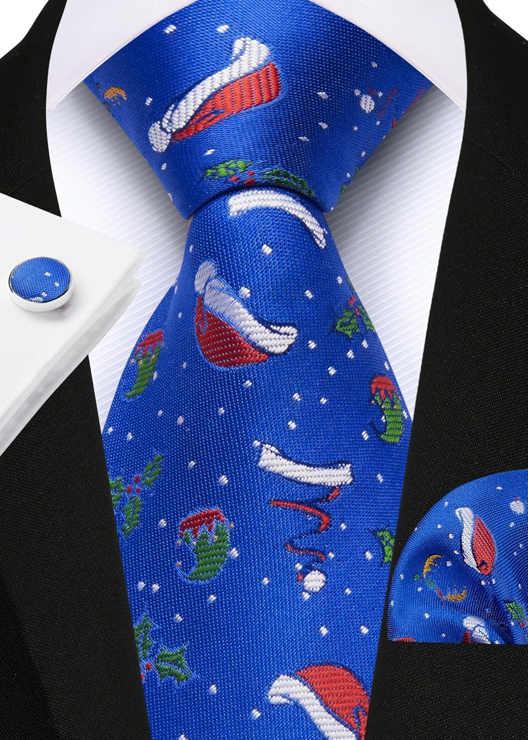 HISDERN Christmas Ties for Men Pre-tied Mens Holiday Silk Tie and Pocket Square Cufflinks Set Xmas Festive Funny Necktie(Festive Blue-xmas Hat& Holly)