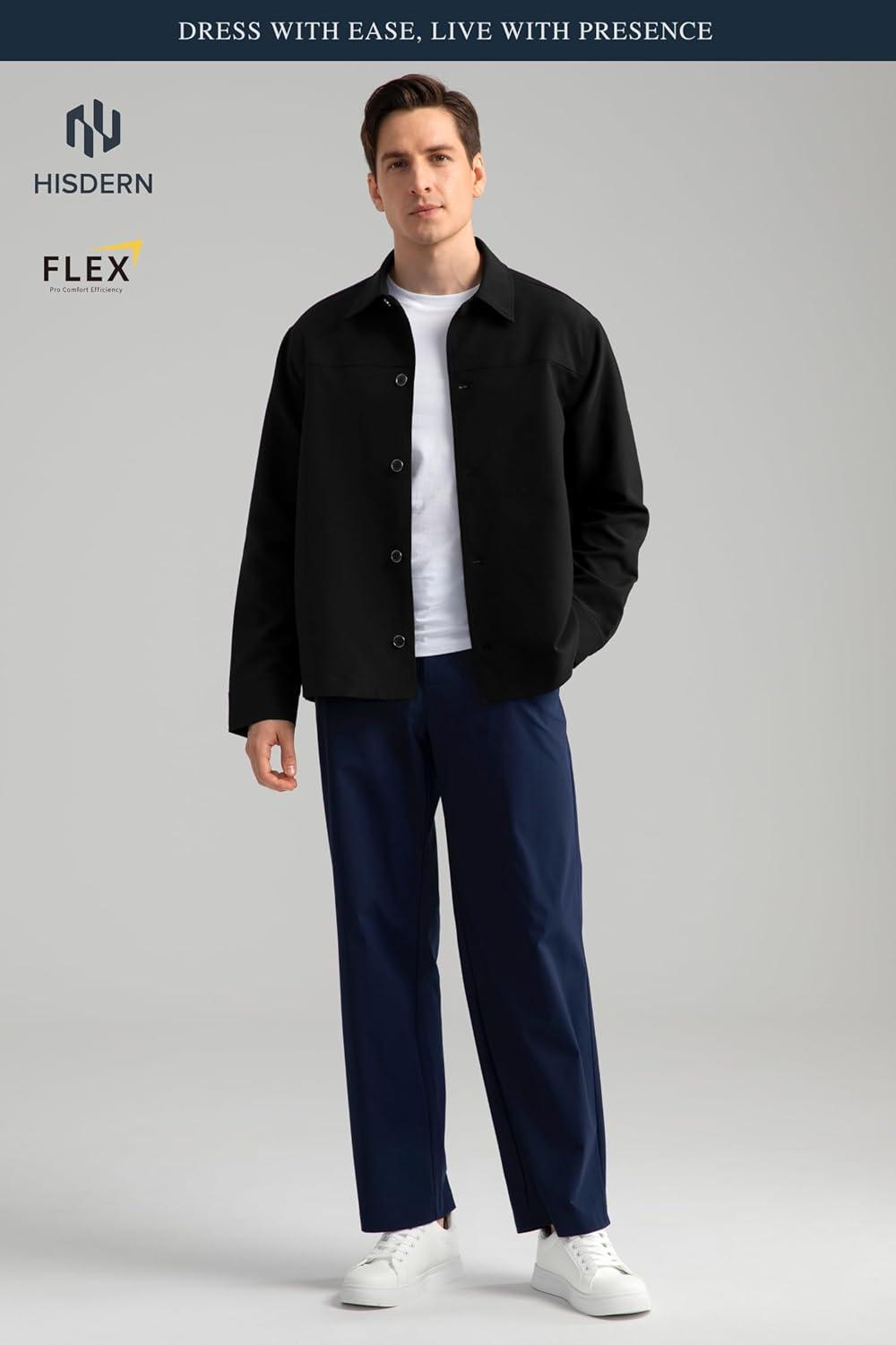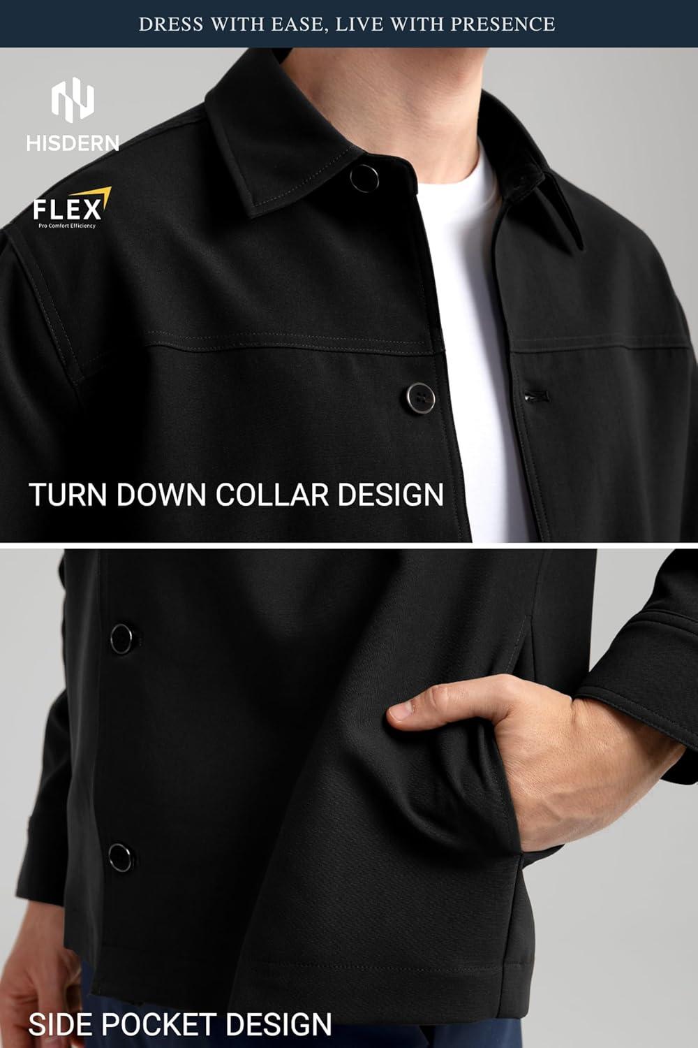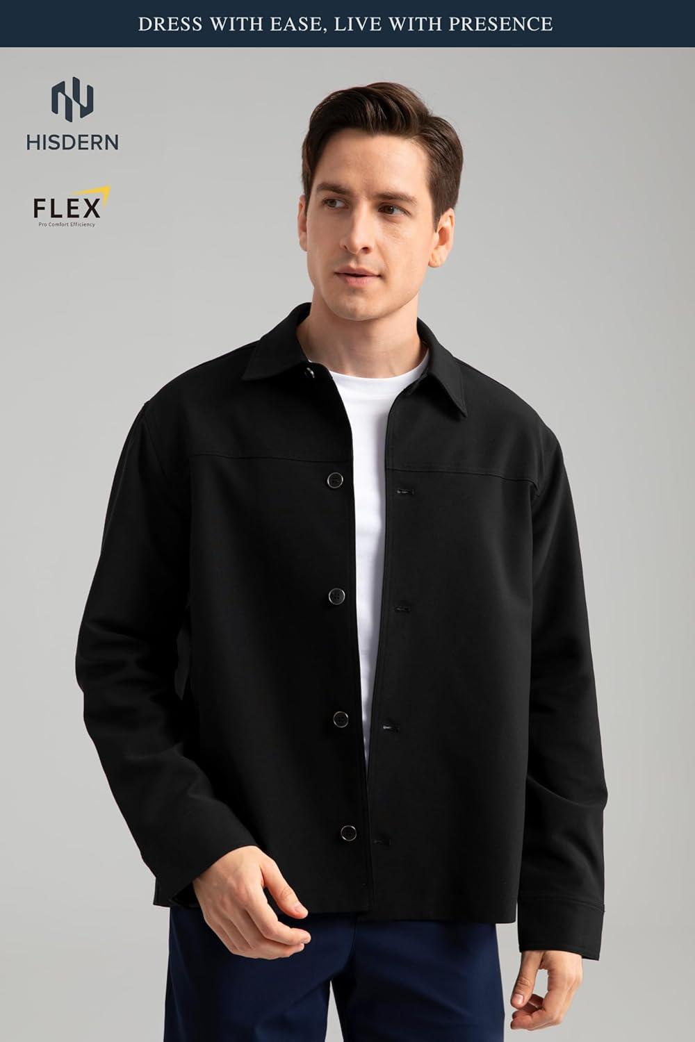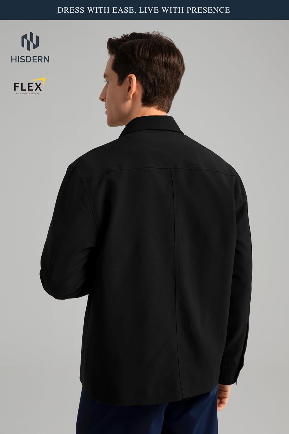 HISDERN FLEX 531 Men’s Button Down Shirt Jacket Comfy Lightweight Design for Business Casual and Social Events with Pockets(Black)