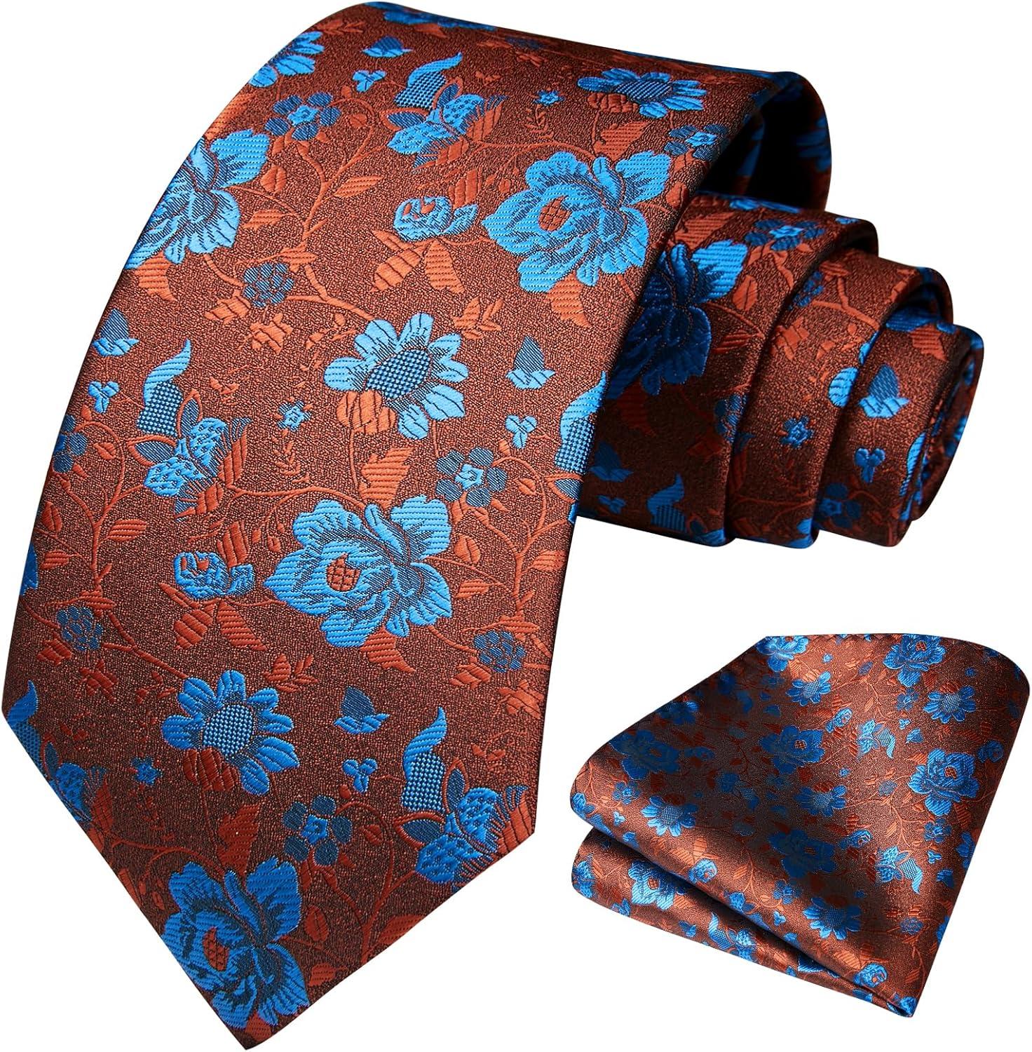 HISDERN Men Floral Ties Woven Classic 3.4″ Necktie Set Formal Tie Pocket Square for Wedding with Handkerchief Gift Box(Orange Blue Flower)