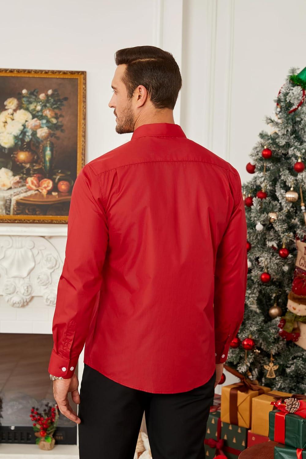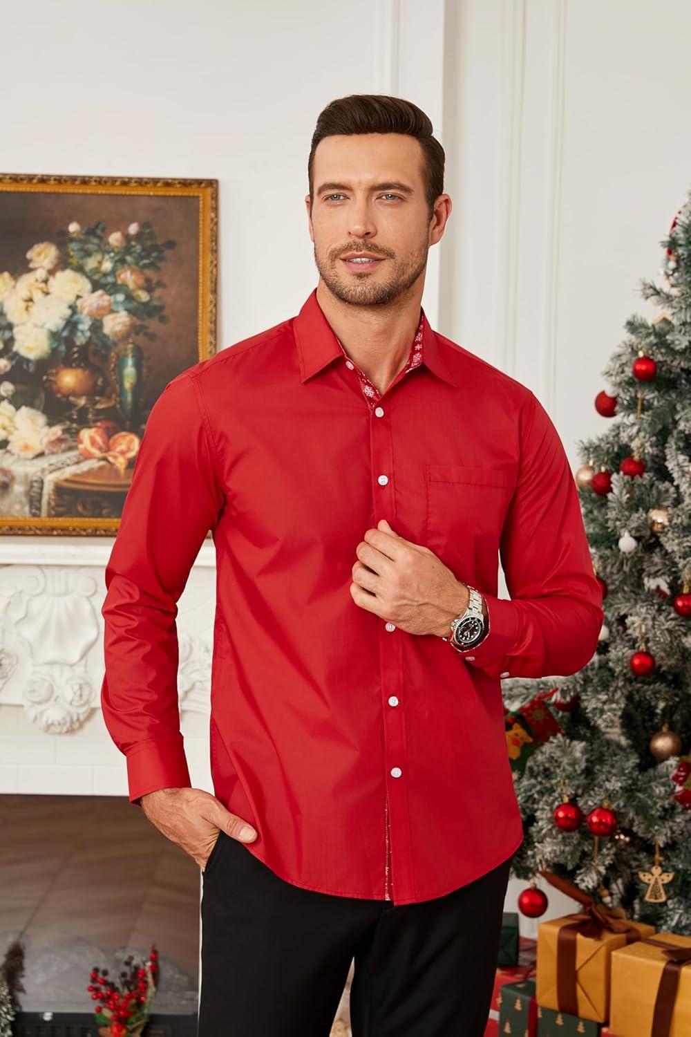HISDERN Mens Business Dress Shirts Long Sleeve Casual Button Down Shirt Formal Inner Collar Contrast Shirt for Men Wedding(Red Christma)
