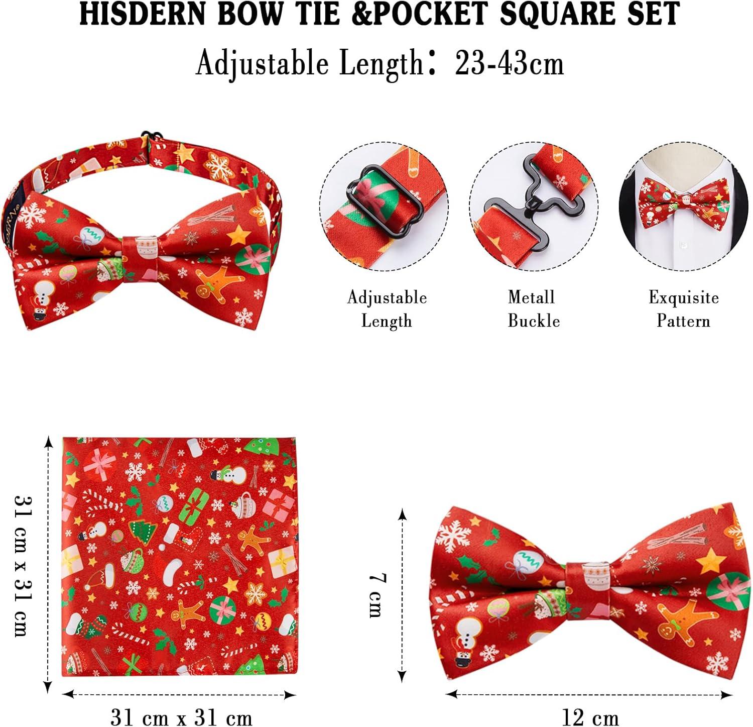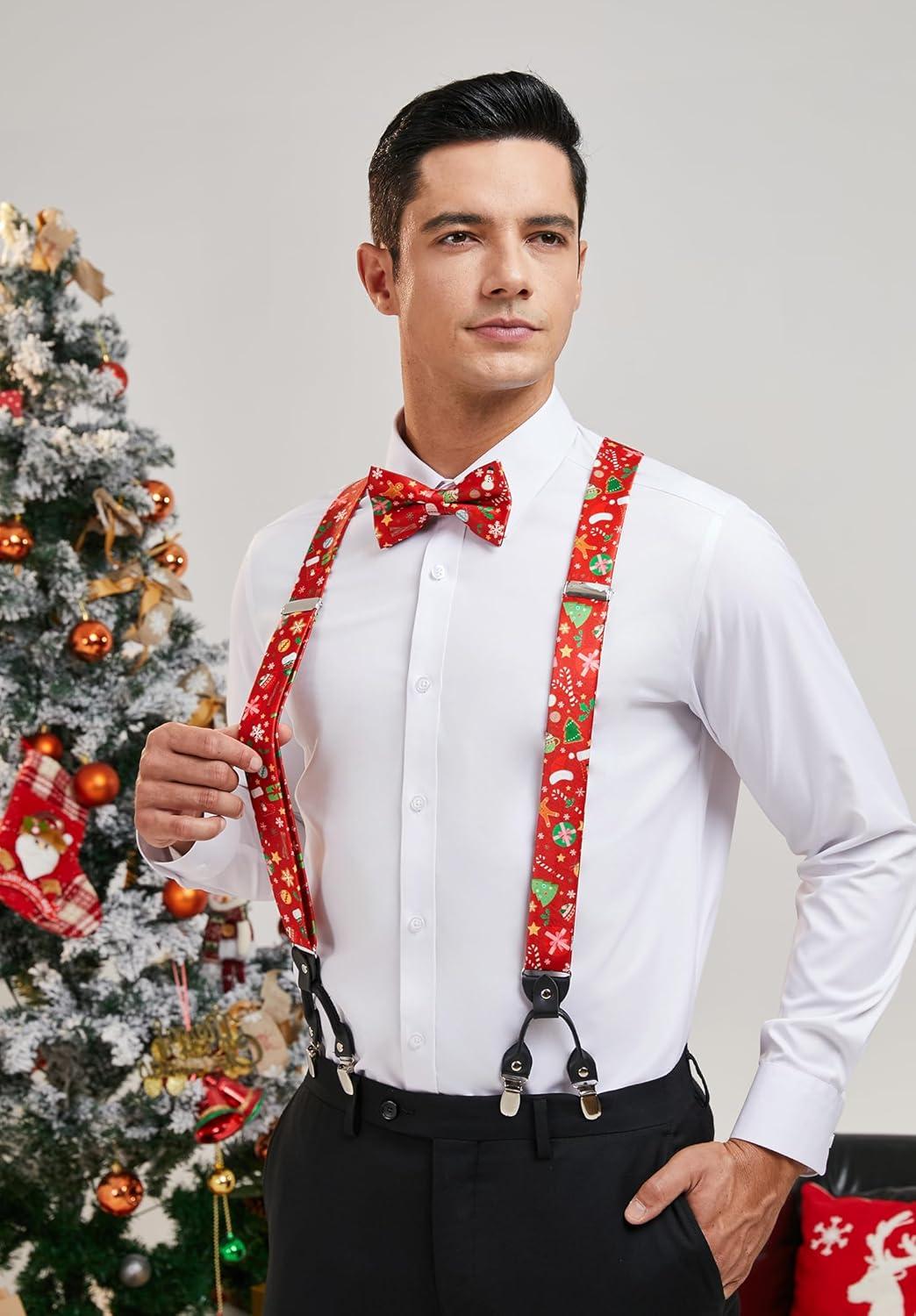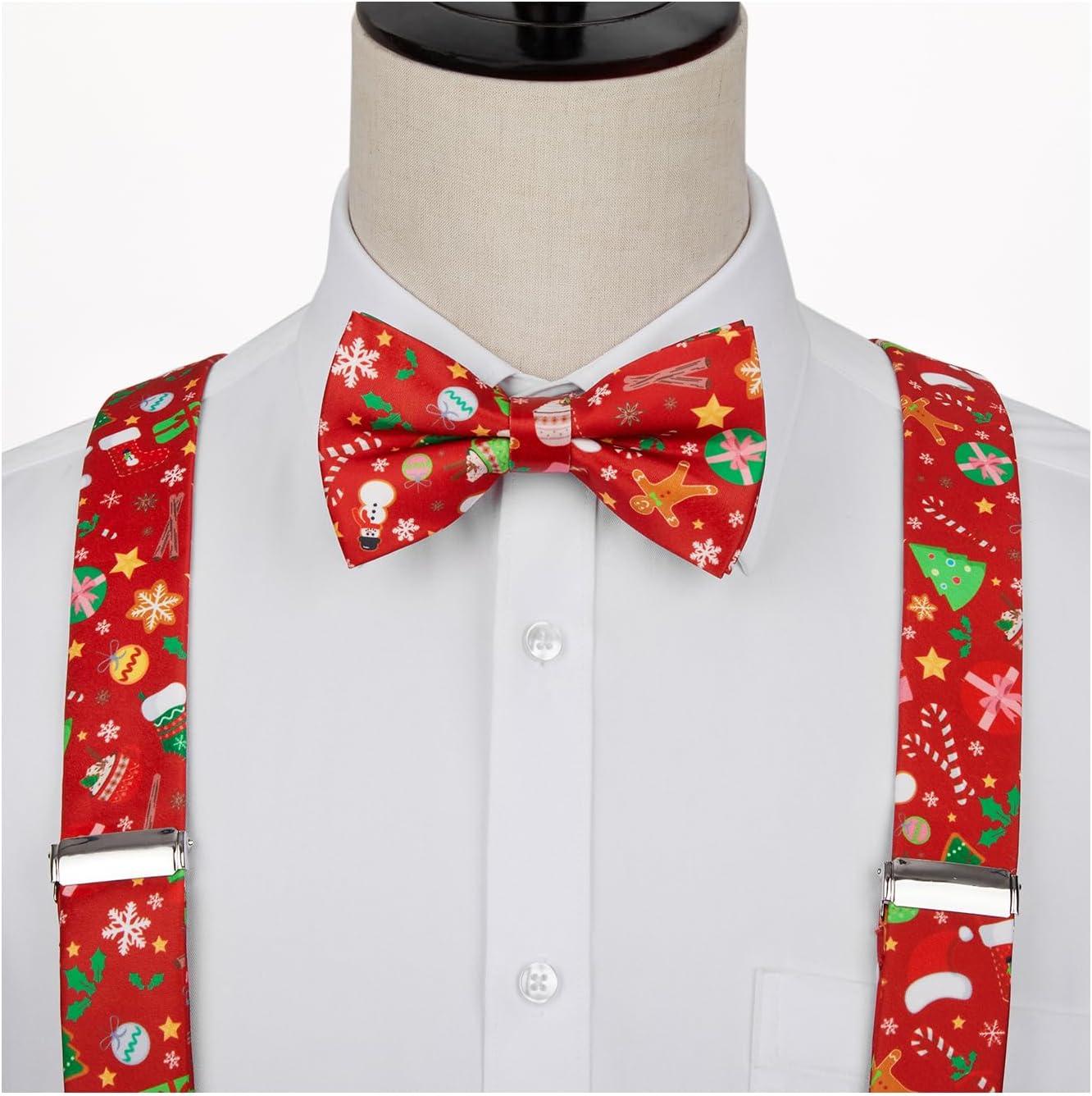 HISDERN Mens Christmas Bow Tie and Suspenders Holiday Festival Braces Y Shape Fun Santa Braces Handkerchief Pocket Square Set(Red / Green)