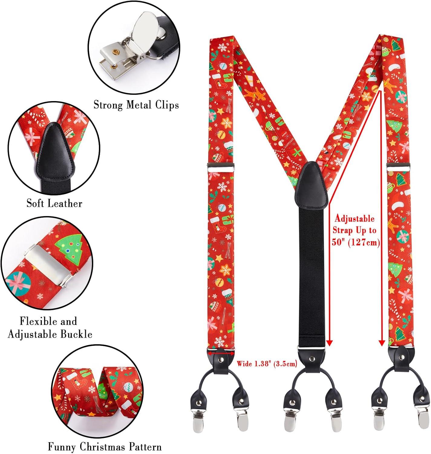 HISDERN Mens Christmas Bow Tie and Suspenders Holiday Festival Braces Y Shape Fun Santa Braces Handkerchief Pocket Square Set(Red)