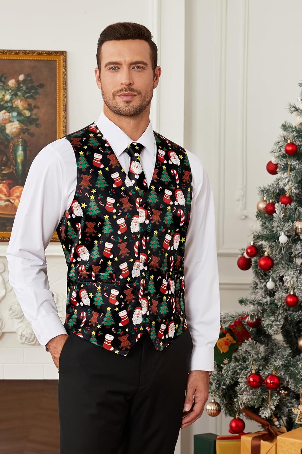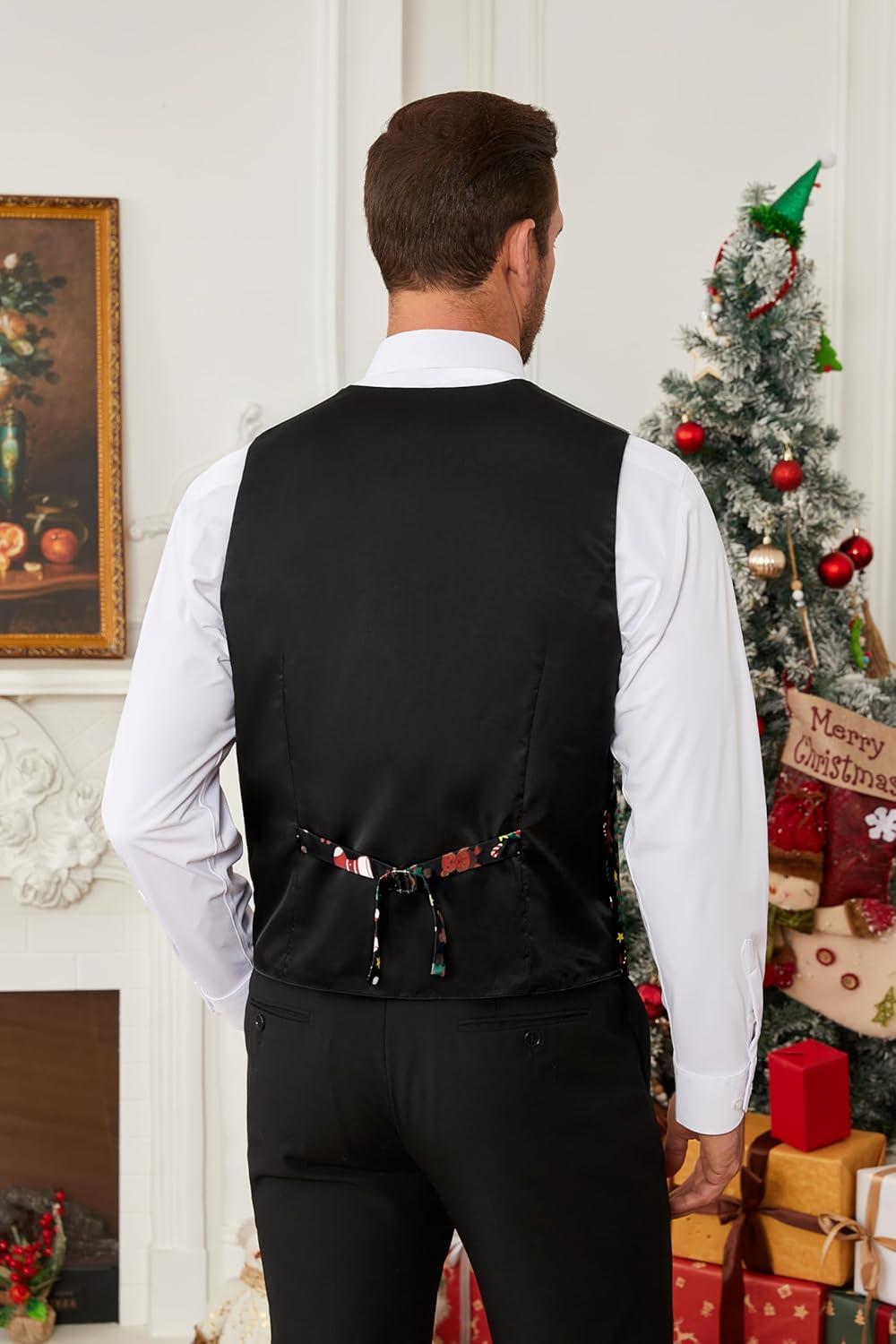 HISDERN Mens Christmas Suit Vest Funny Holiday Dress Vests Tie and Pocket Square Set for Men Xmas Festival Party(Black Santa)