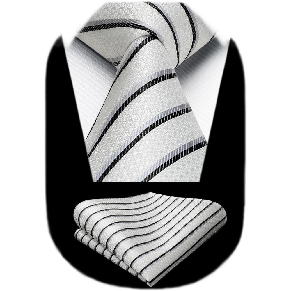 HISDERN Mens Striped Ties Classic Silk Woven Tie and Pocket Square Set Formal Business Necktie Handkerchief for Wedding(White)