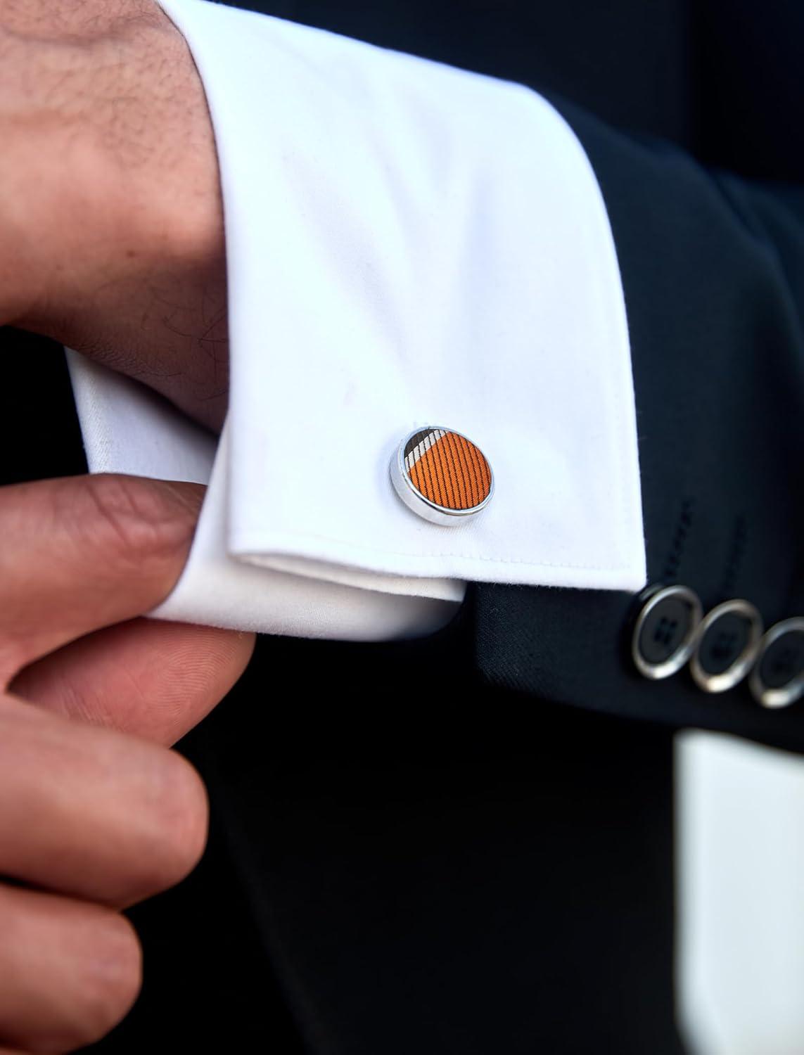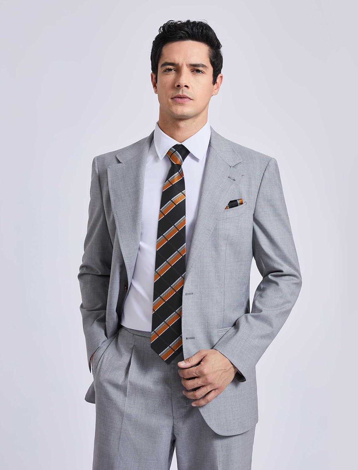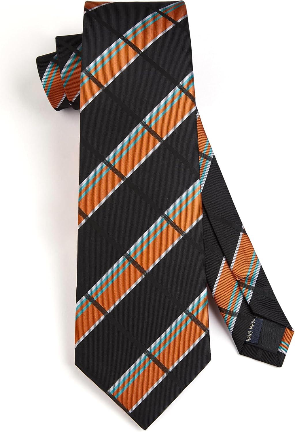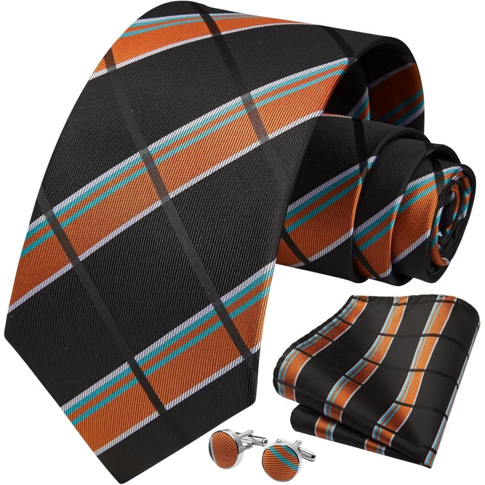 HISDERN Mens Tie Set Stripe Plaid Ties with Pocket Square Cufflinks Formal Business Silk Necktie Handkerchief for Men(Black Orange)
