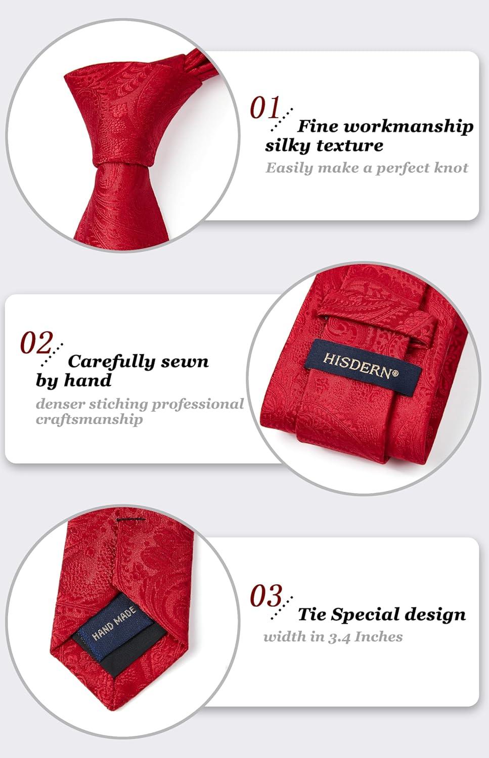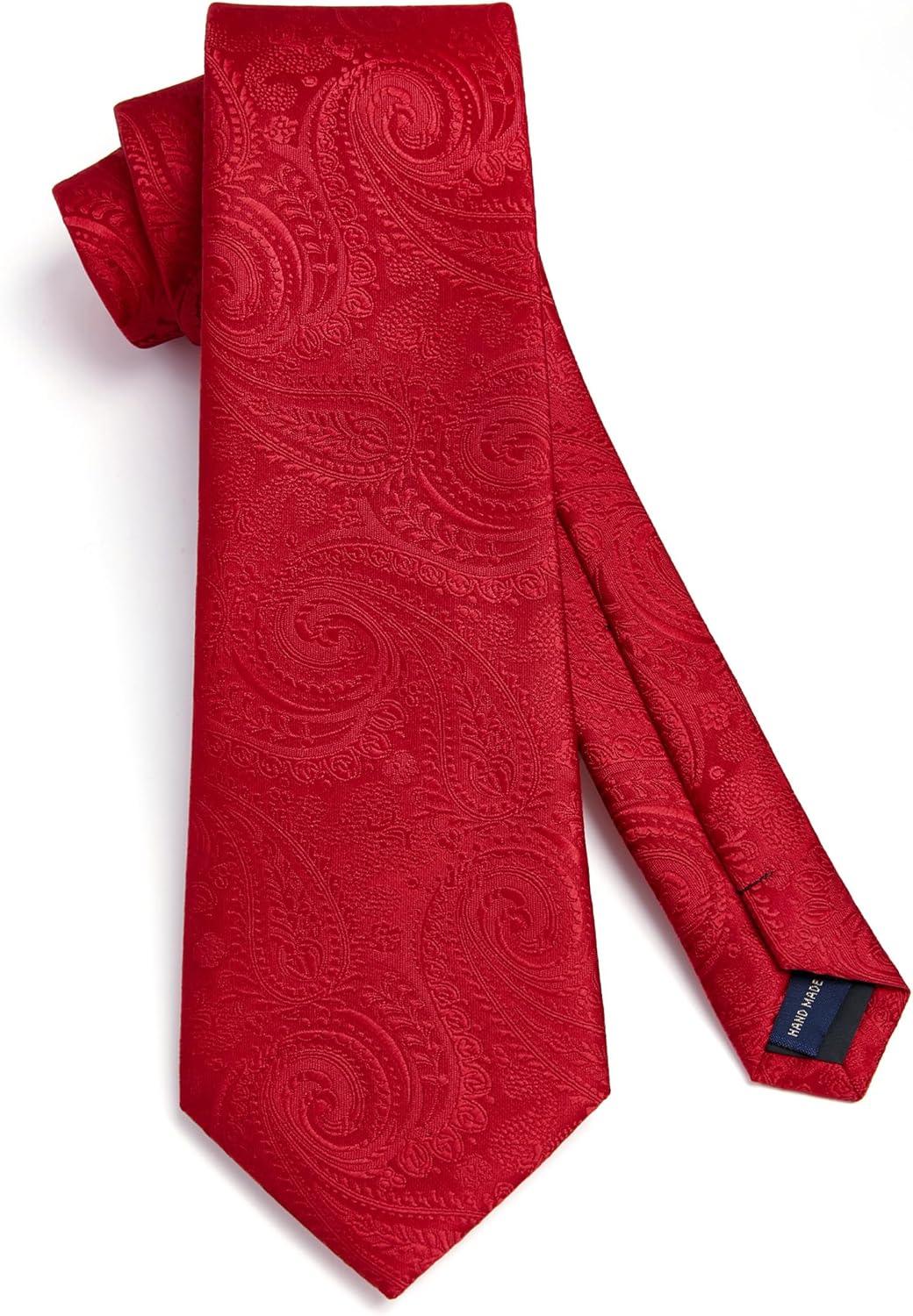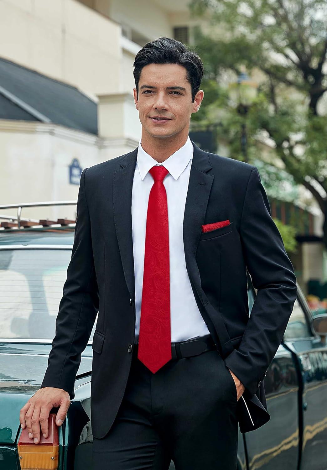 HISDERN Ties for Men Paisley Floral Mens Ties and Pocket Square Cufflinks Set Classic Business Necktie Handkerchief(A1-red1)