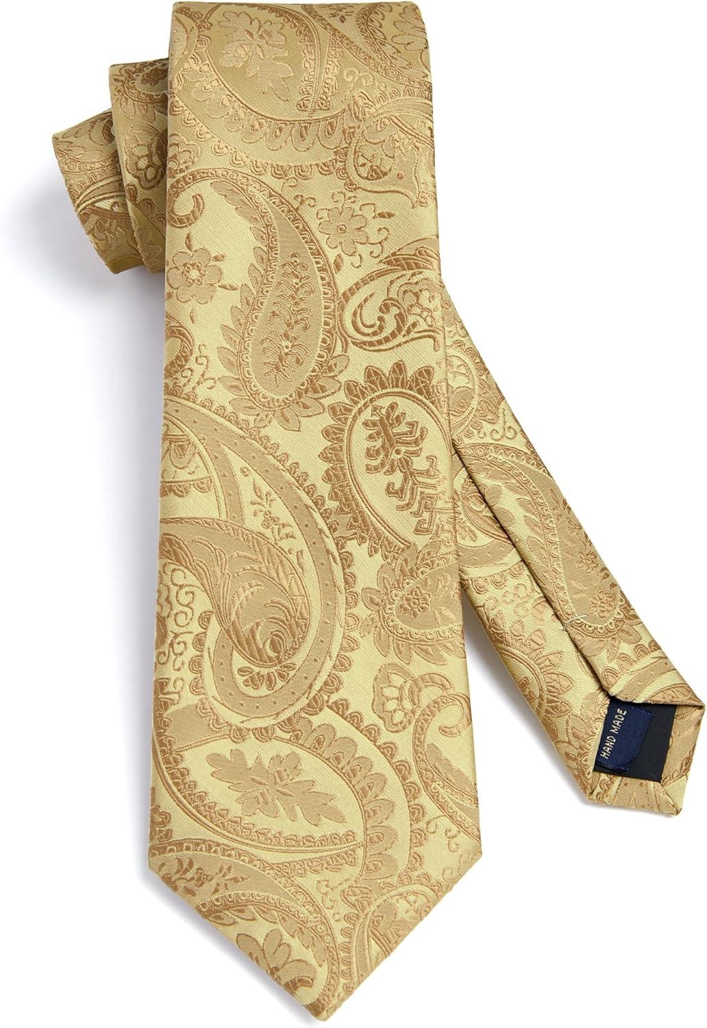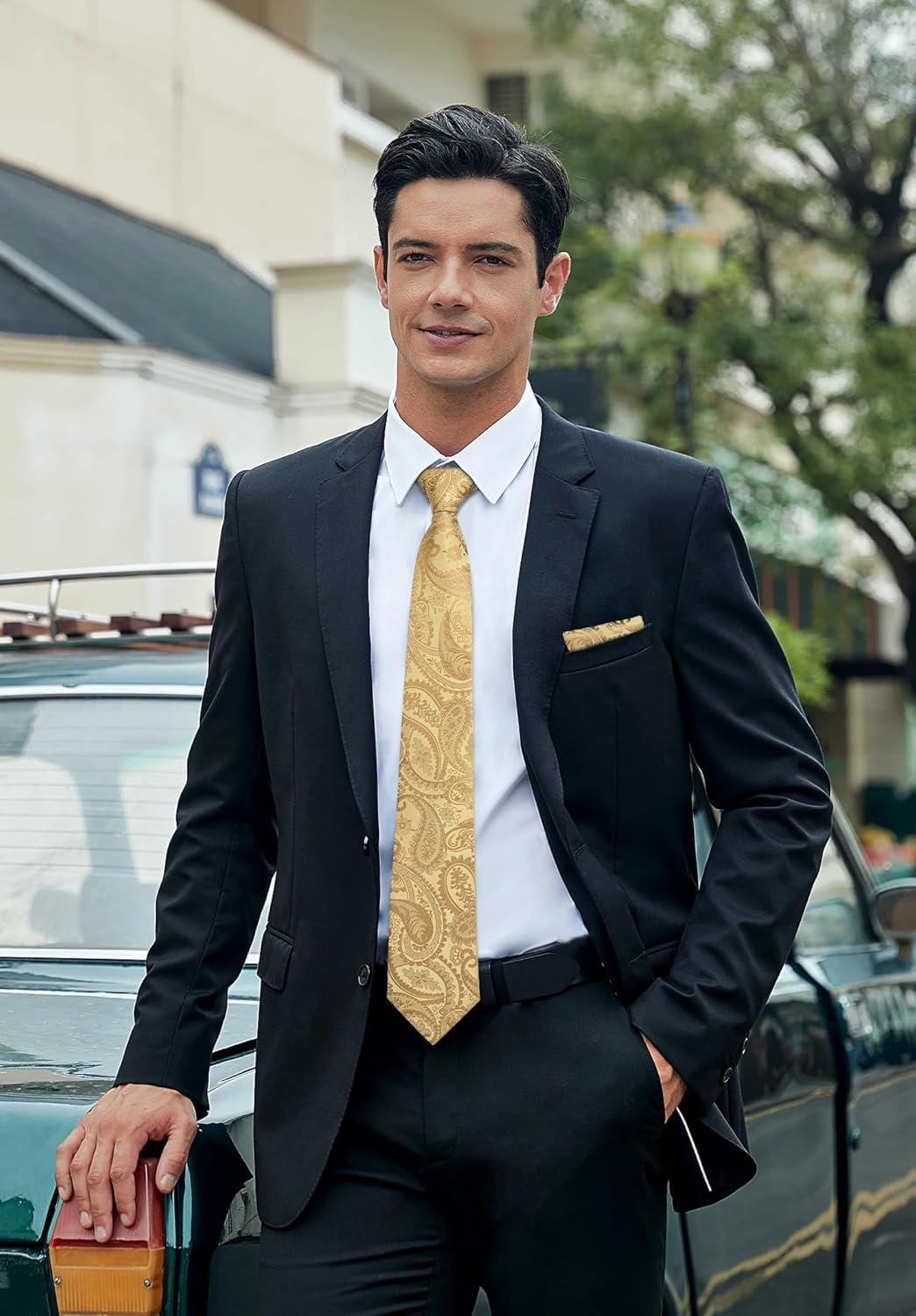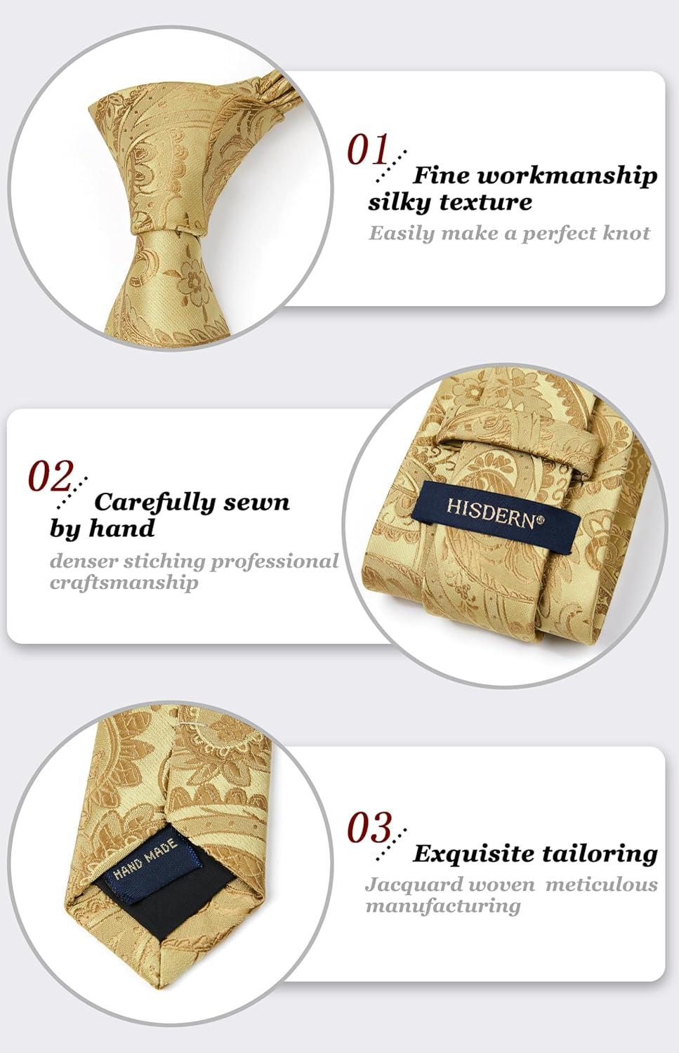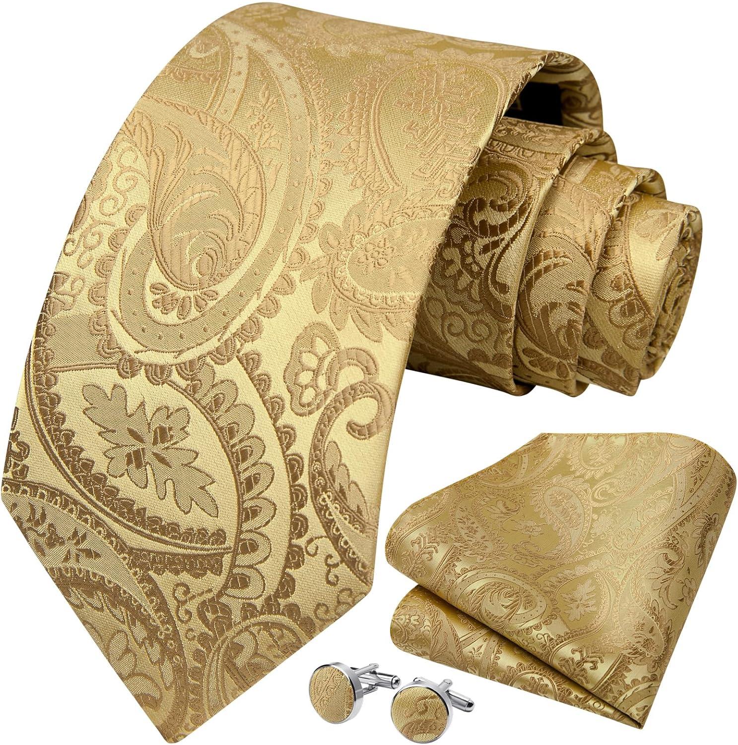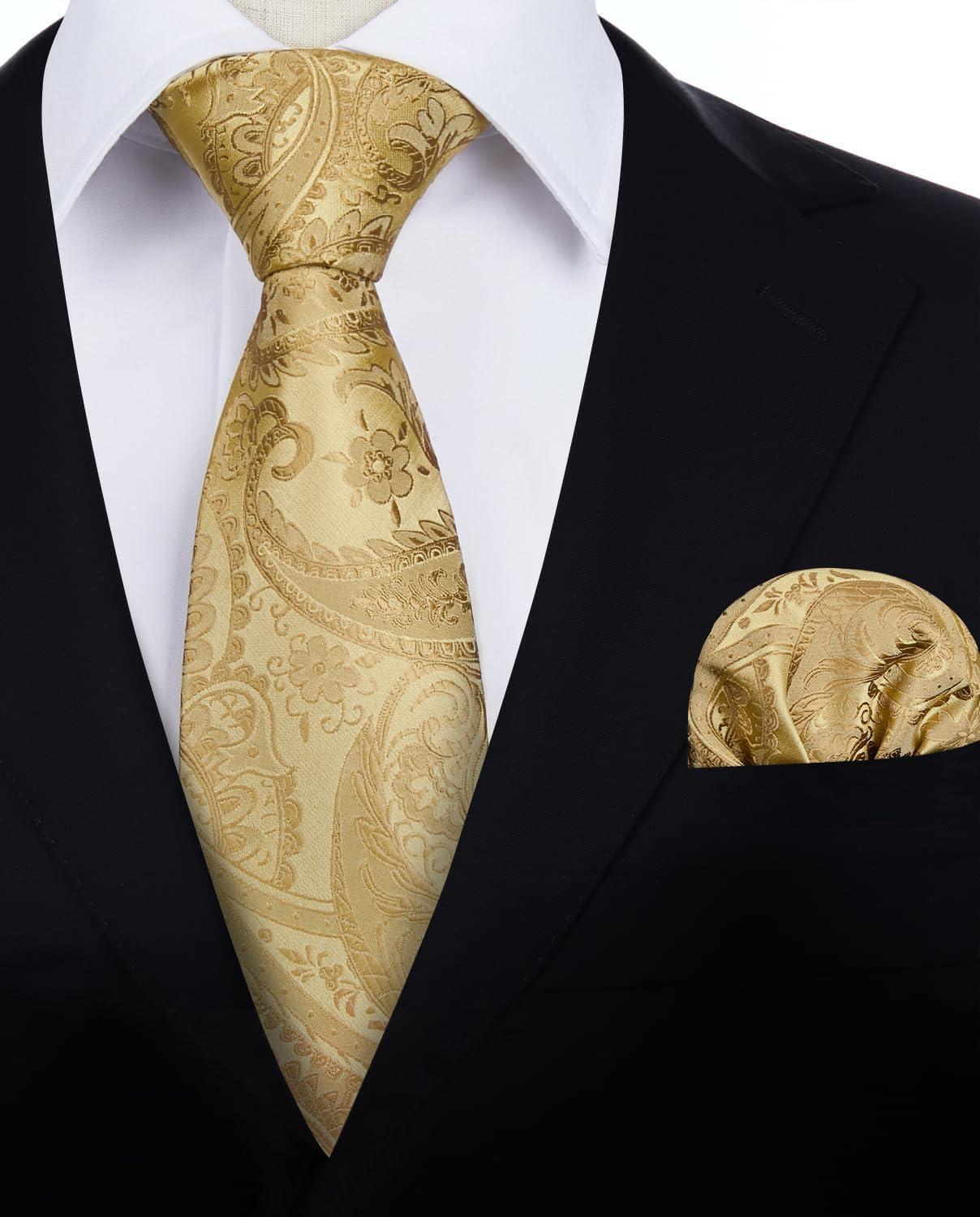 HISDERN Ties for Men Paisley Floral Mens Ties and Pocket Square Cufflinks Set Classic Business Necktie Handkerchief(C-gold)