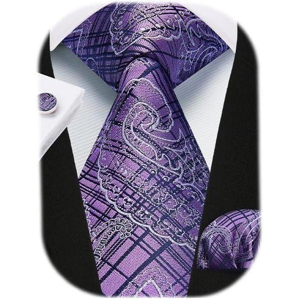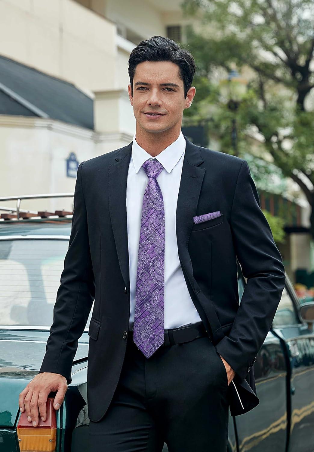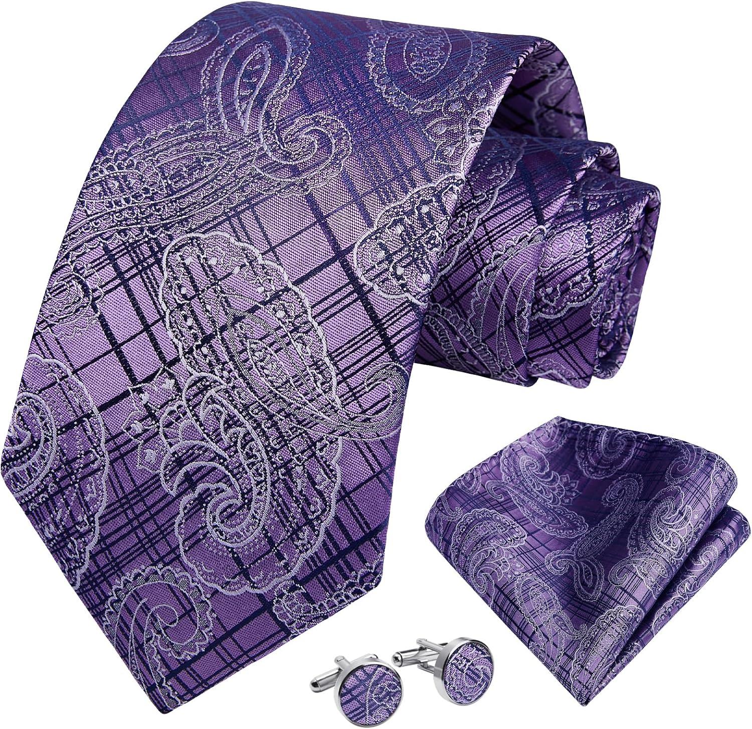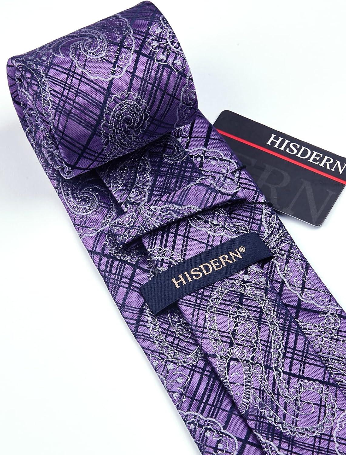 HISDERN Ties for Men Paisley Floral Mens Ties and Pocket Square Cufflinks Set Classic Business Necktie Handkerchief(D3-purple)