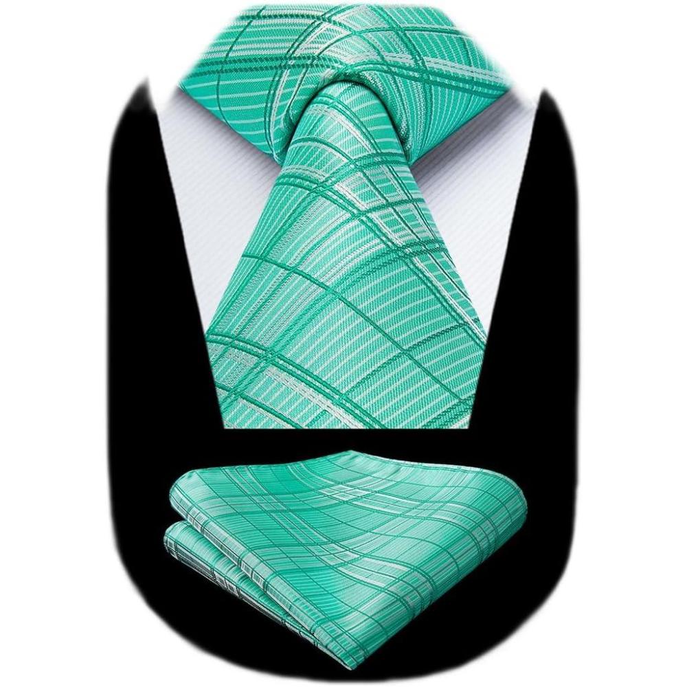 HISDERN Ties for Men Silk Extra Long Tie and Pocket Square Classic Plaid Checkered 63 inches Men’s Neckties Business(B6-aqua Green)