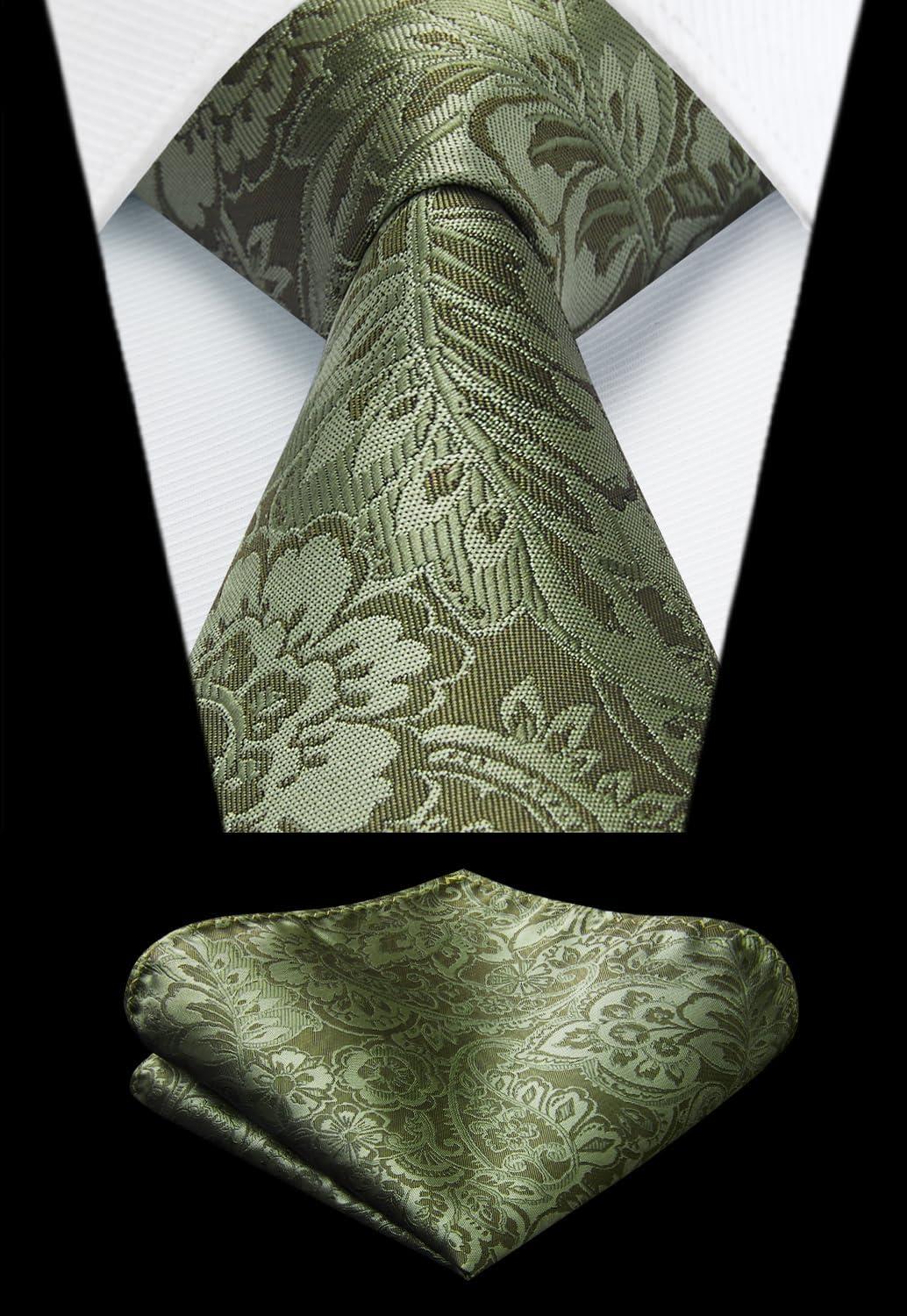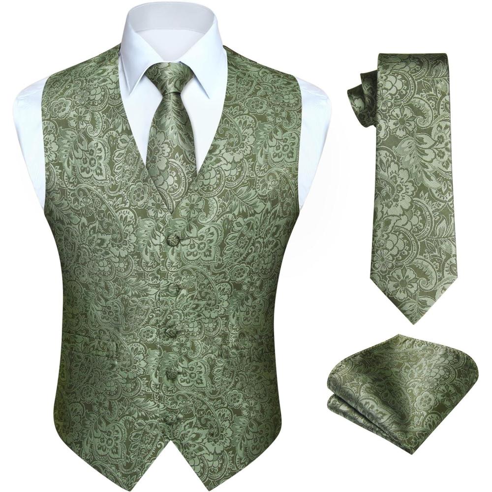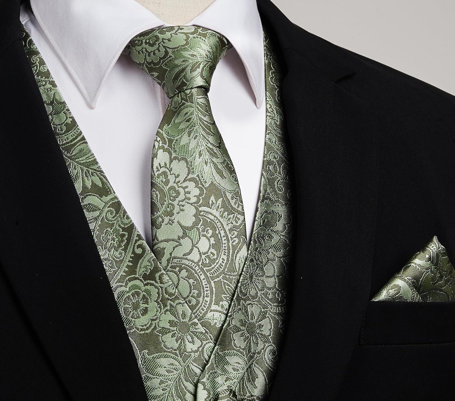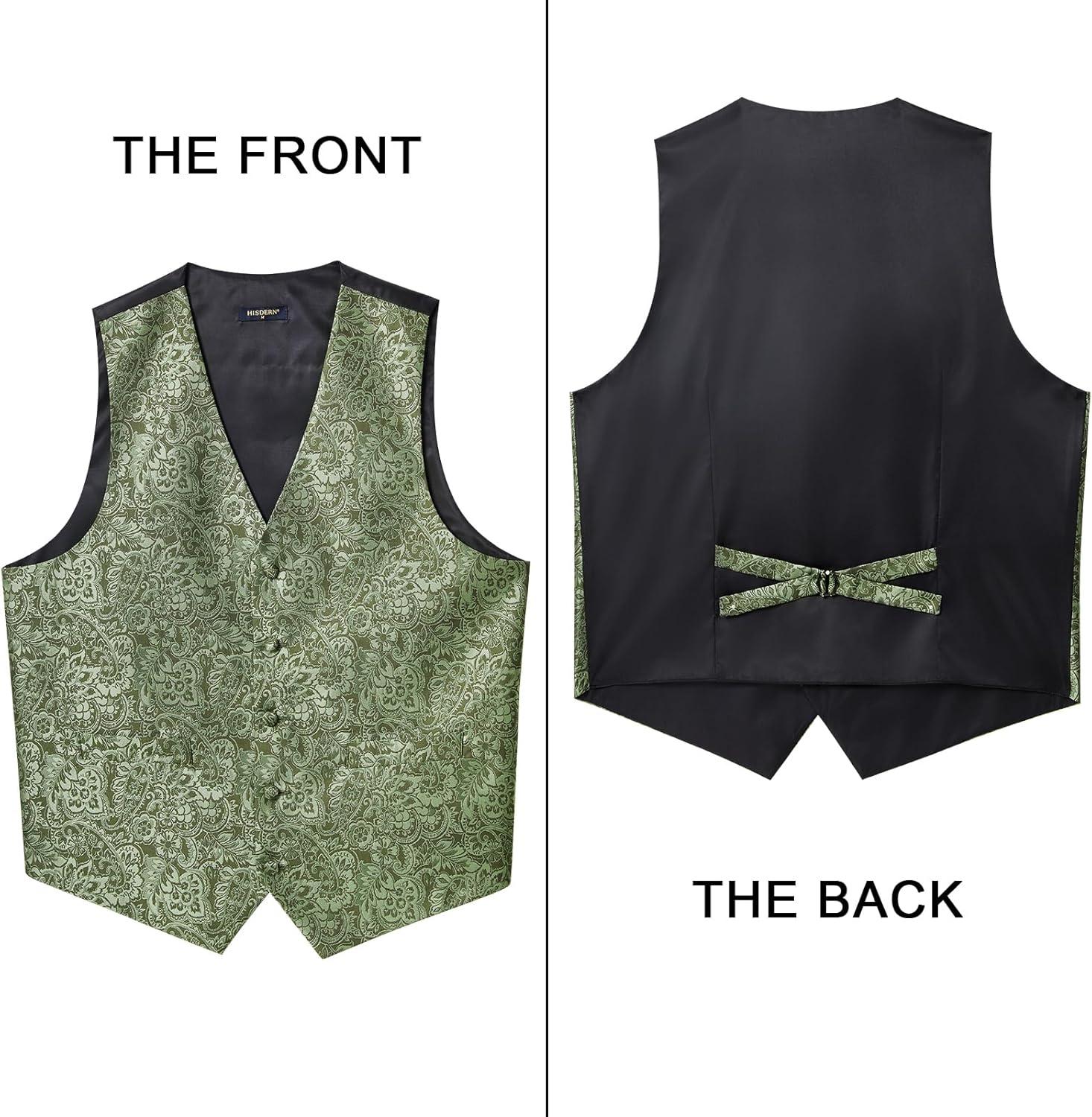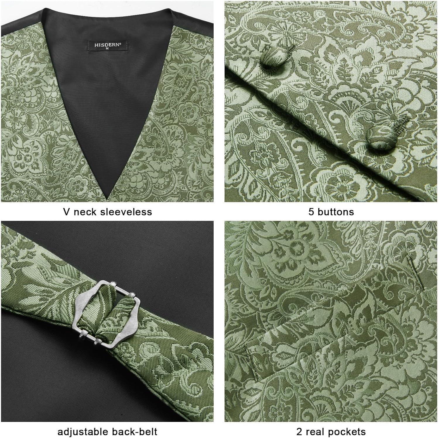 HISDERN V3-01 Men’s 3PCS Formal Vest Set Slim Fit Jacquard Waistcoat with Paisley Floral Pattern for Wedding Prom Party(C-green 2)