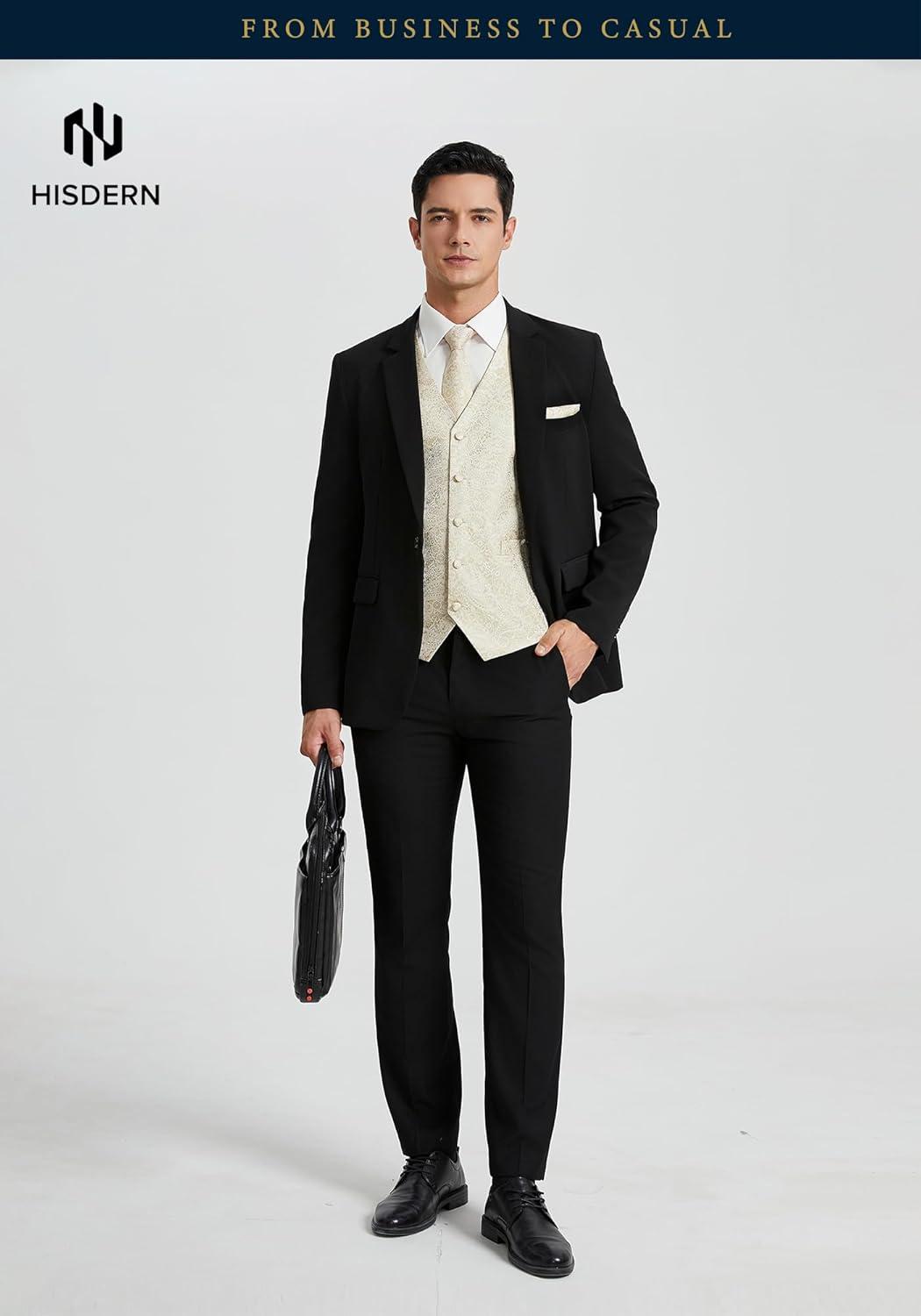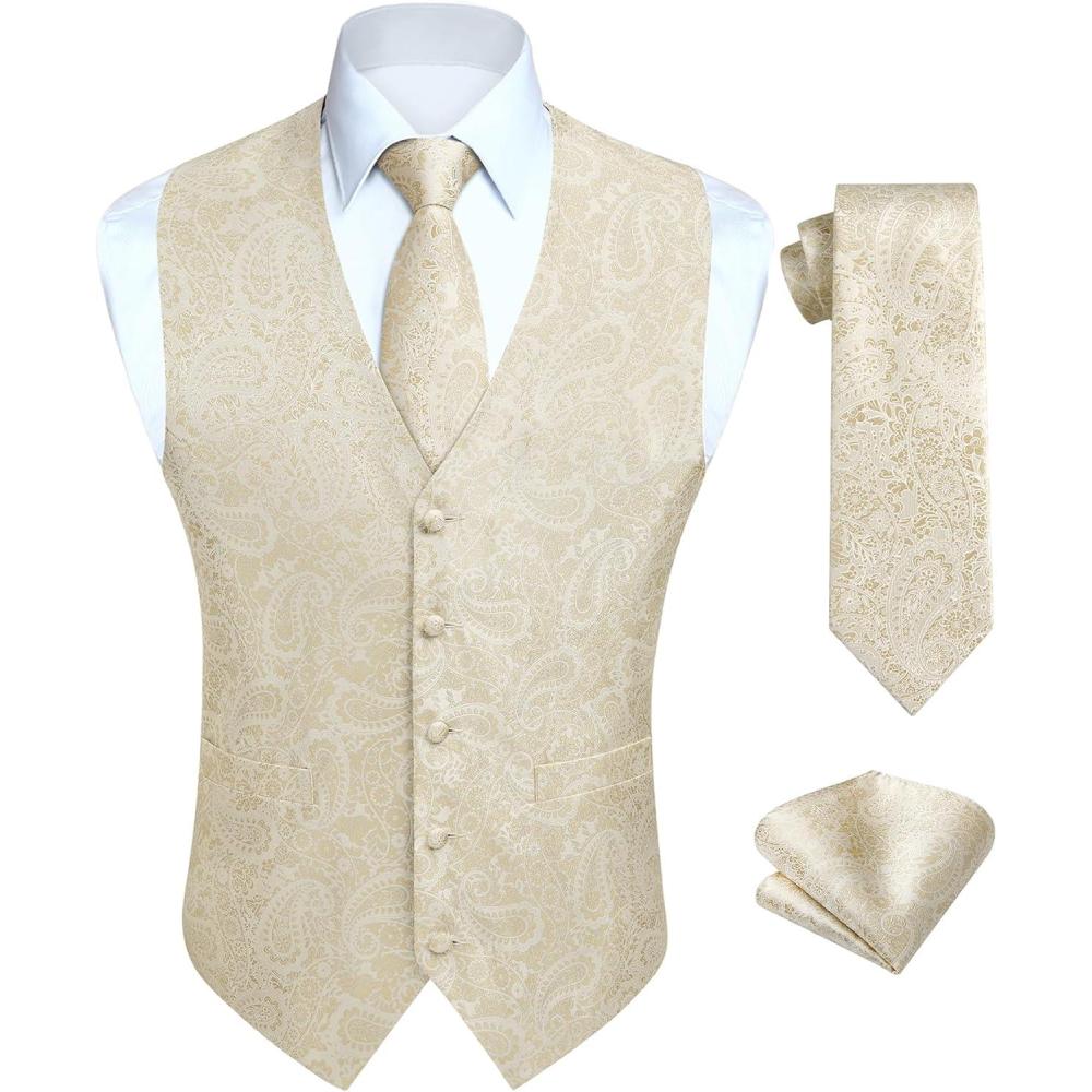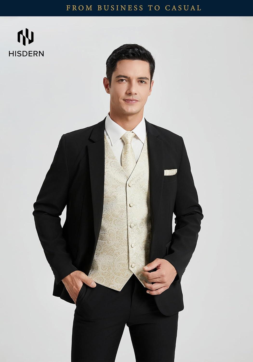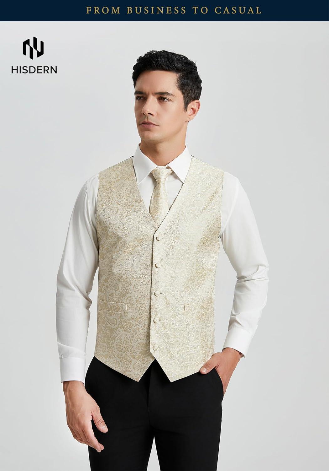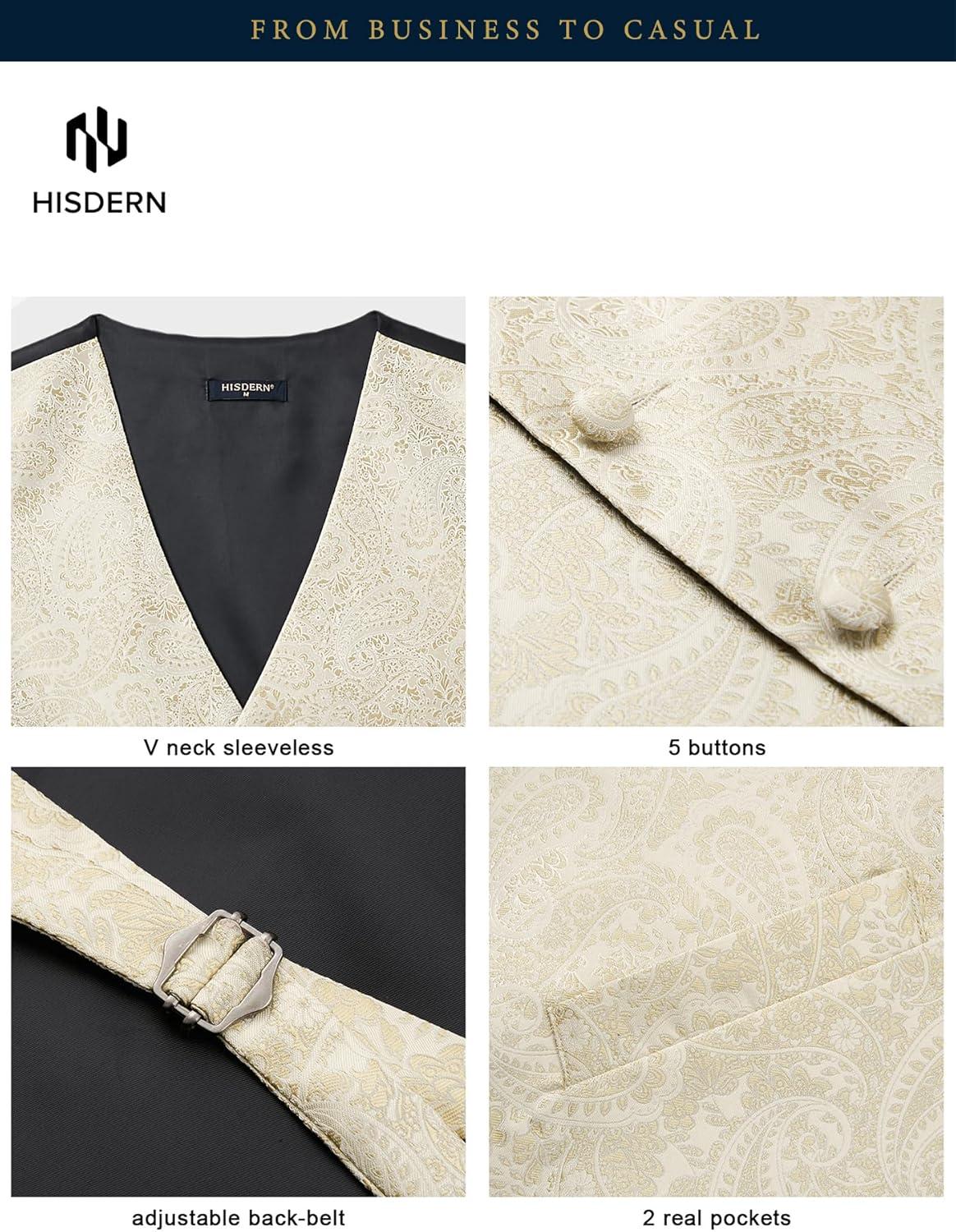 HISDERN V3-01 Men’s 3PCS Formal Vest Set Slim Fit Jacquard Waistcoat with Paisley Floral Pattern for Wedding Prom Party(Champagne/N2)