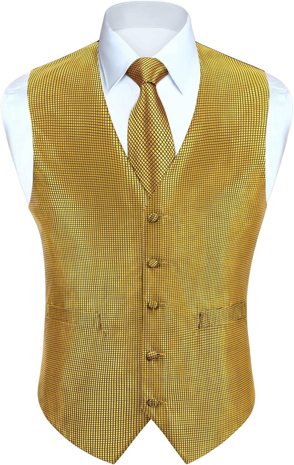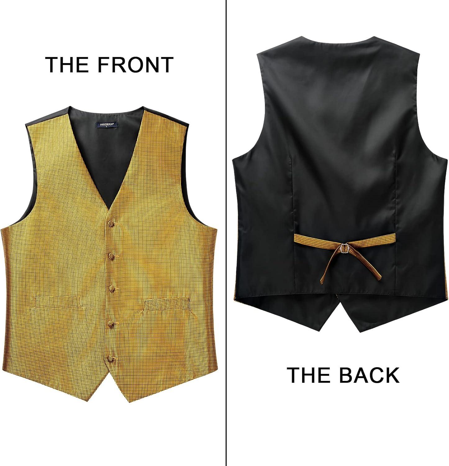 Experience elegance with Men's Suit Vest. The suit vest is a crafted blend of silk and polyester, providing a luxurious sheen and a comfortable feel. It stands for quality, durability and a touch of elegance. These vest sizes are not the same as the US size. Please check the size chart carefully on the product picture instead of the Amazon size chart.10 optional size; Tie Width: 3.4 inches & Tie Length: 59 inches; Handkerchief size: 12 inches x 12 inches.The paisley jacquard pattern is a timeless design that adds a level of sophistication to any outfit. The vibrant solid color are suitable to make you stand out in the crowd. V neck, 2 pockets,5 button front, and features an adjuster strap in the back to take in or let out for a proper fit.This 3 piece set includes a suit vest, necktie, and pocket square. They can be paired with shirts, suits, tuxedos, and even jeans to create an Eye-Catching outfit for any occasion.Whether it's a Wedding, Graduation, prom, Party, Show or formal meeting, Office, Working, this suit vest set is your go-to choice. It’s a Surprise present for Father's Day, wedding, birthday, Christmas, Halloween, and Thanksgiving Day.