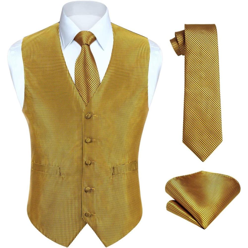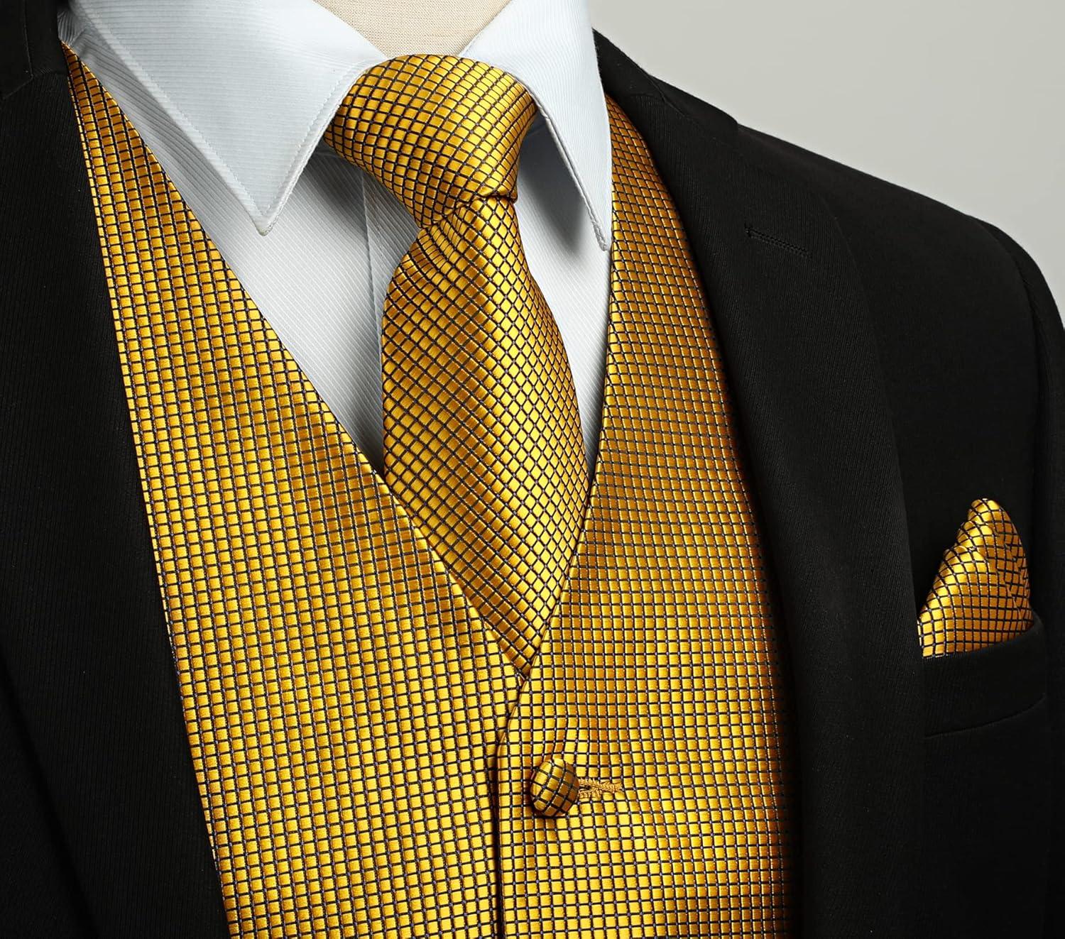 HISDERN V3-01 Men’s 3PCS Formal Vest Set Slim Fit Jacquard Waistcoat with Paisley Floral Pattern for Wedding Prom Party(Gold/N1)