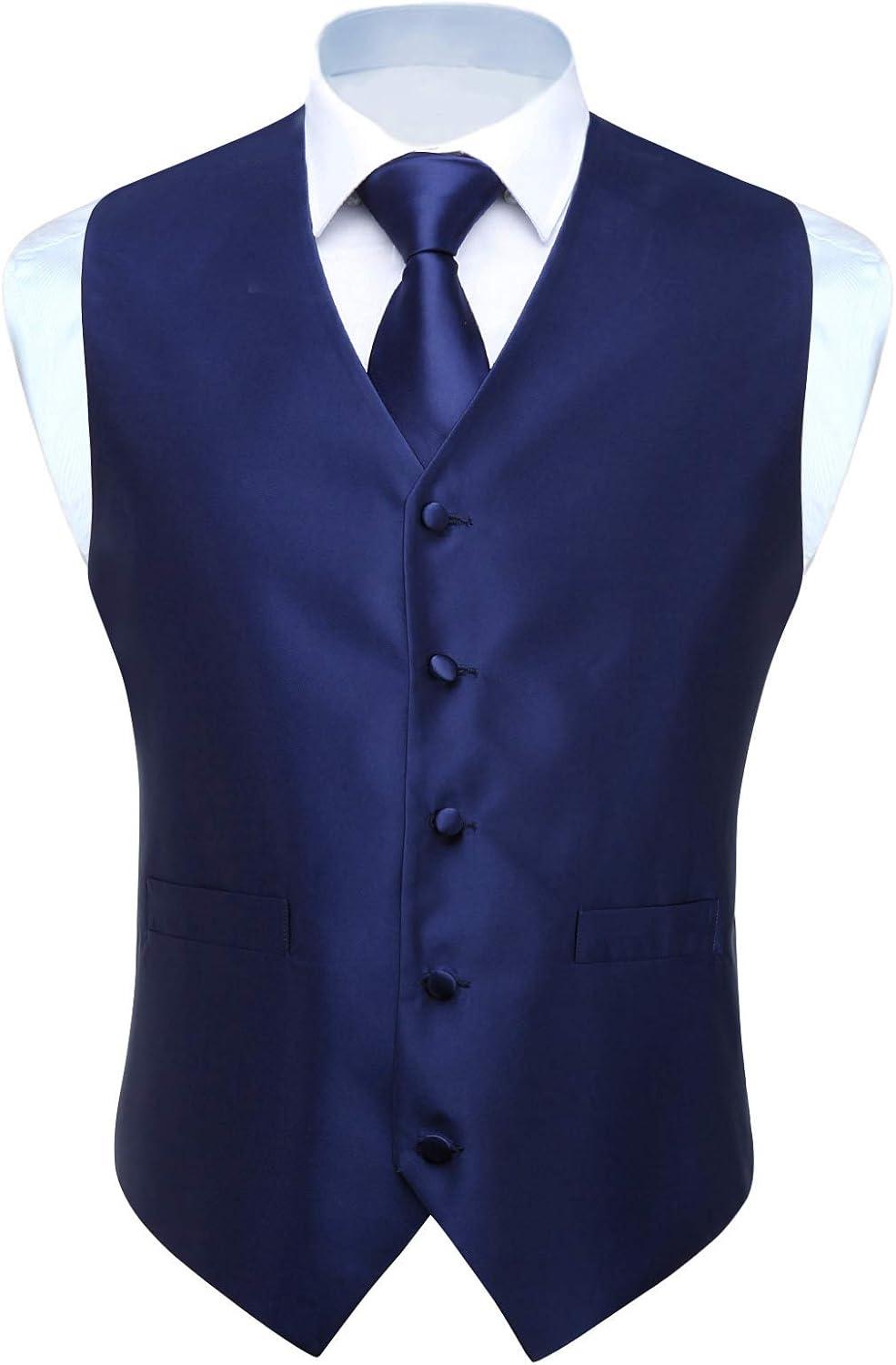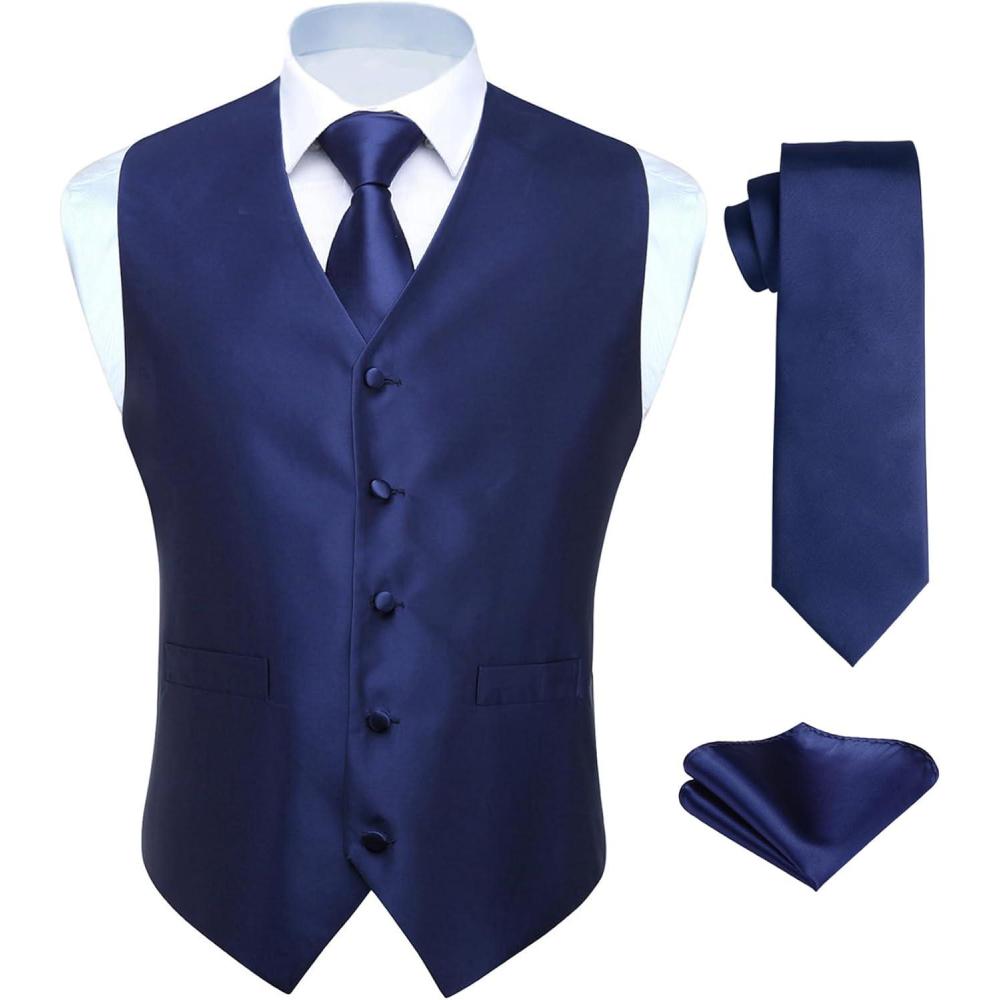 Experience elegance with Men's Suit Vest. The suit vest is a crafted blend of silk and polyester, providing a luxurious sheen and a comfortable feel. It stands for quality, durability and a touch of elegance. These vest sizes are not the same as the US size. Please check the size chart carefully on the product picture instead of the Amazon size chart.10 optional size; Tie Width: 3.4 inches & Tie Length: 59 inches; Handkerchief size: 12 inches x 12 inches.The paisley jacquard pattern is a timeless design that adds a level of sophistication to any outfit. The vibrant solid color are suitable to make you stand out in the crowd. V neck, 2 pockets,5 button front, and features an adjuster strap in the back to take in or let out for a proper fit.This 3 piece set includes a suit vest, necktie, and pocket square. They can be paired with shirts, suits, tuxedos, and even jeans to create an Eye-Catching outfit for any occasion.Whether it's a Wedding, Graduation, prom, Party, Show or formal meeting, Office, Working, this suit vest set is your go-to choice. It’s a Surprise present for Father's Day, wedding, birthday, Christmas, Halloween, and Thanksgiving Day.