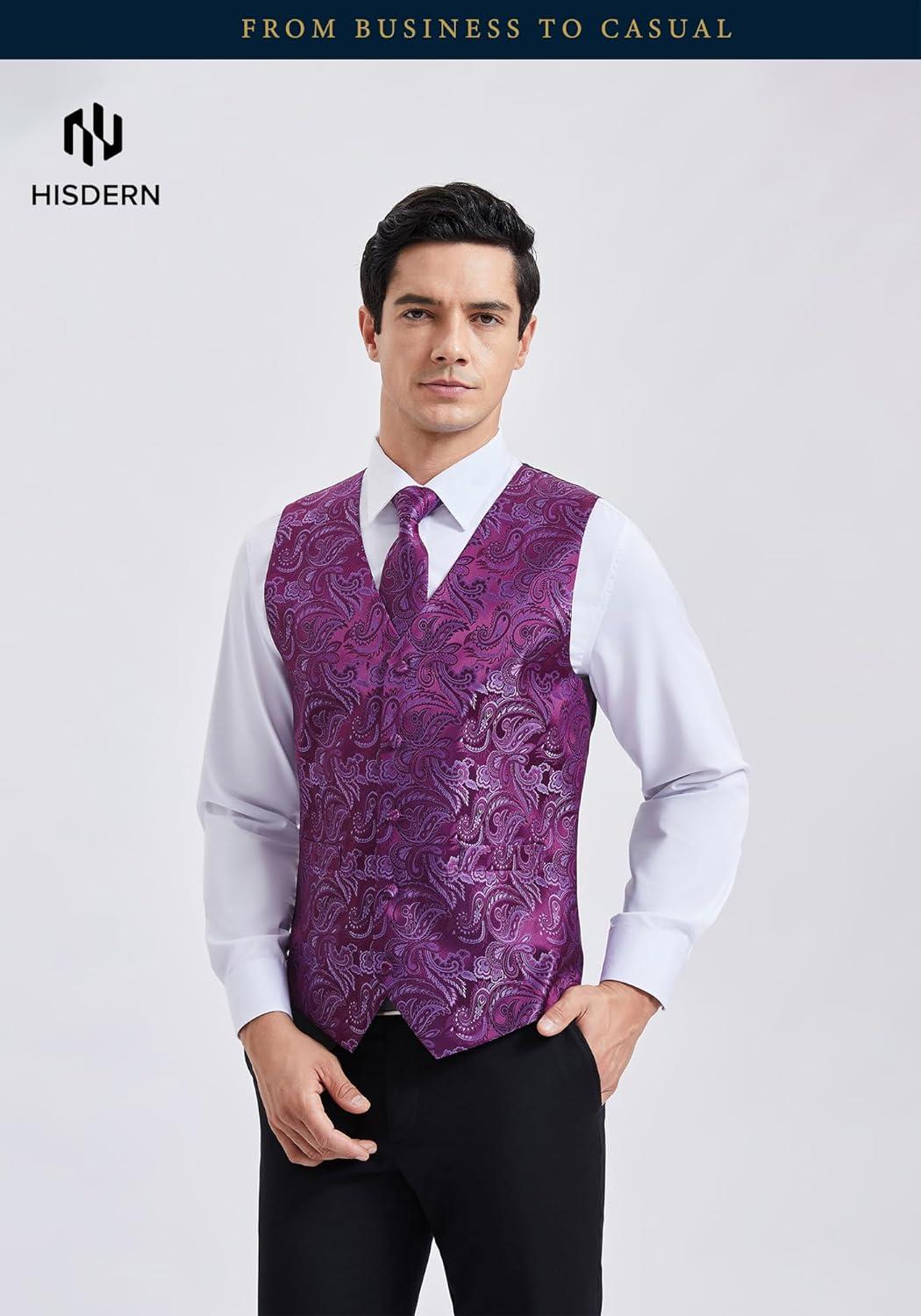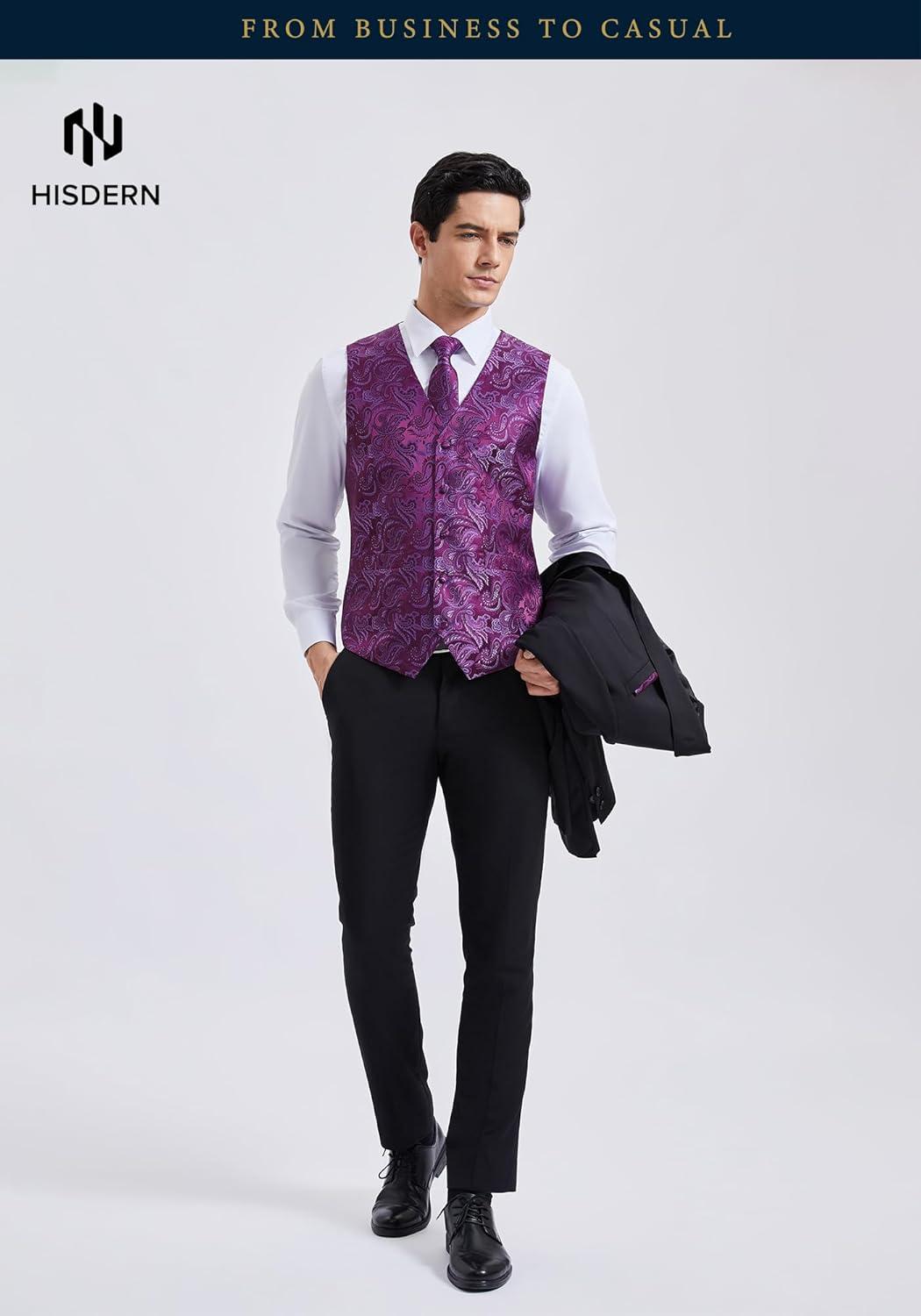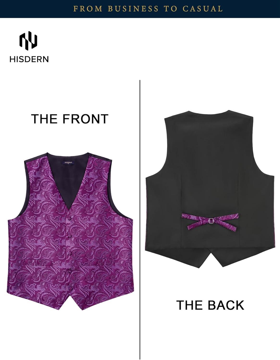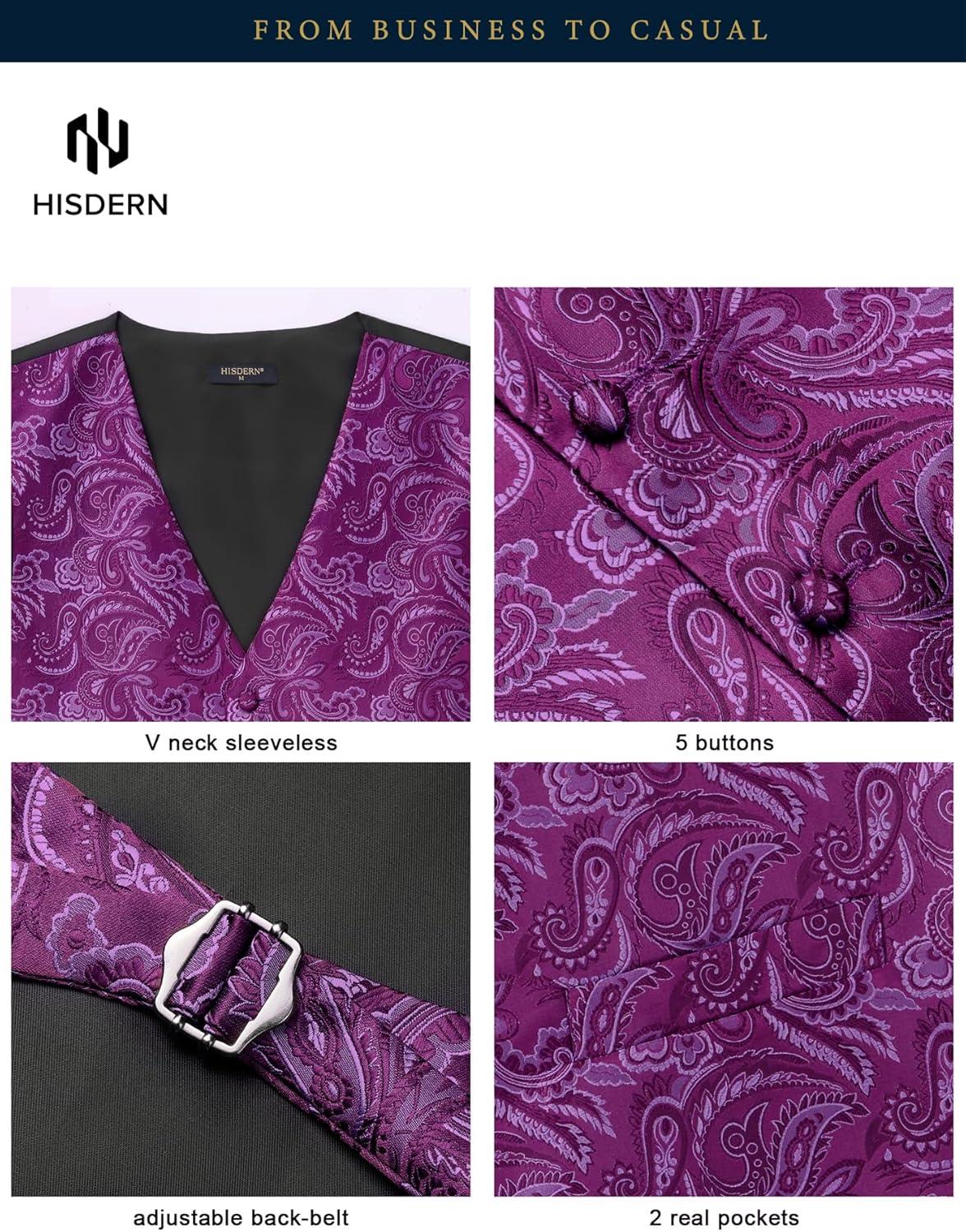 HISDERN V3-01 Men’s 3PCS Formal Vest Set Slim Fit Jacquard Waistcoat with Paisley Floral Pattern for Wedding Prom Party(Purple)