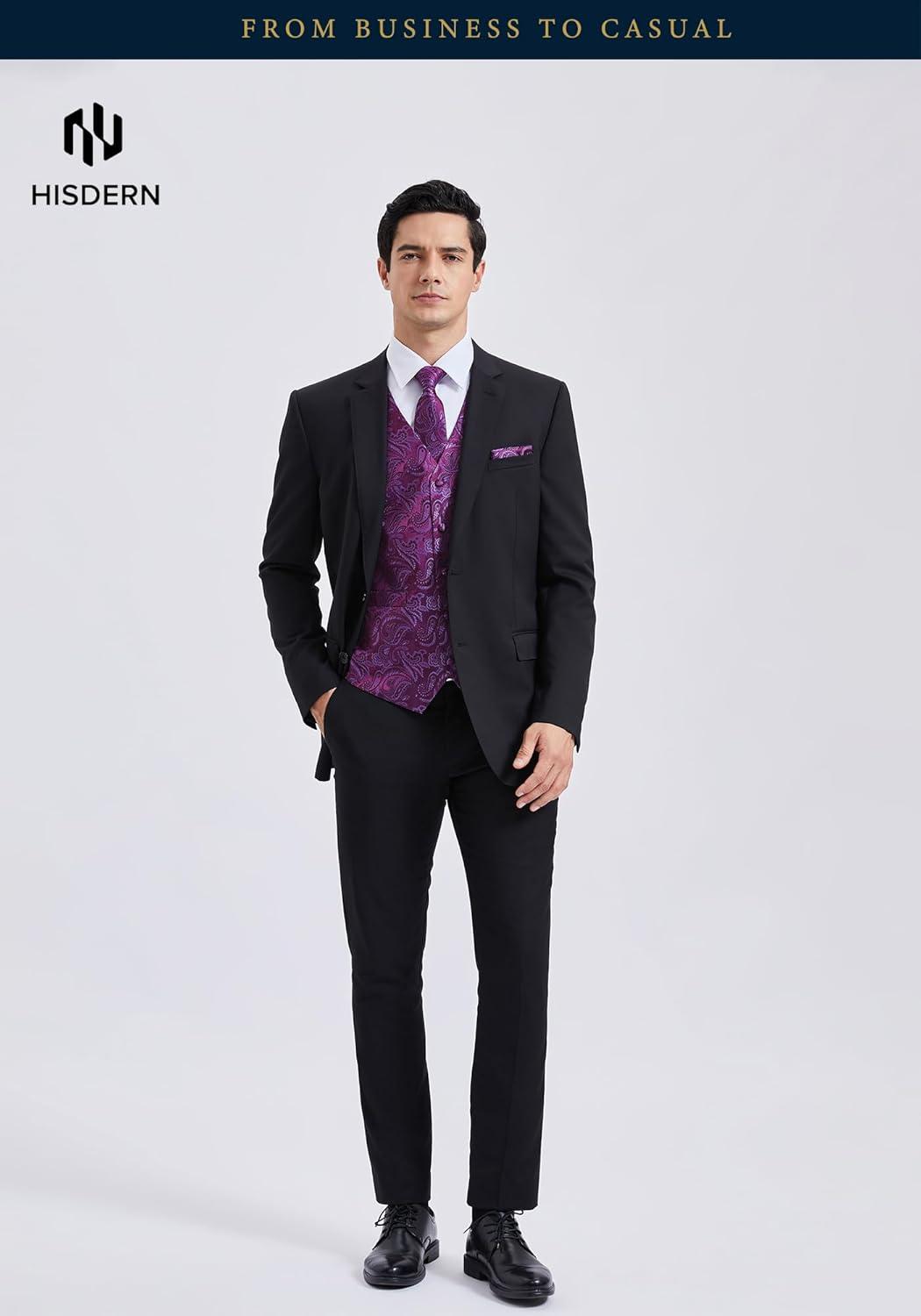 Experience elegance with Men's Suit Vest. The suit vest is a crafted blend of silk and polyester, providing a luxurious sheen and a comfortable feel. It stands for quality, durability and a touch of elegance. These vest sizes are not the same as the US size. Please check the size chart carefully on the product picture instead of the Amazon size chart.10 optional size; Tie Width: 3.4 inches & Tie Length: 59 inches; Handkerchief size: 12 inches x 12 inches.The paisley jacquard pattern is a timeless design that adds a level of sophistication to any outfit. The vibrant solid color are suitable to make you stand out in the crowd. V neck, 2 pockets,5 button front, and features an adjuster strap in the back to take in or let out for a proper fit.This 3 piece set includes a suit vest, necktie, and pocket square. They can be paired with shirts, suits, tuxedos, and even jeans to create an Eye-Catching outfit for any occasion.Whether it's a Wedding, Graduation, prom, Party, Show or formal meeting, Office, Working, this suit vest set is your go-to choice. It’s a Surprise present for Father's Day, wedding, birthday, Christmas, Halloween, and Thanksgiving Day.