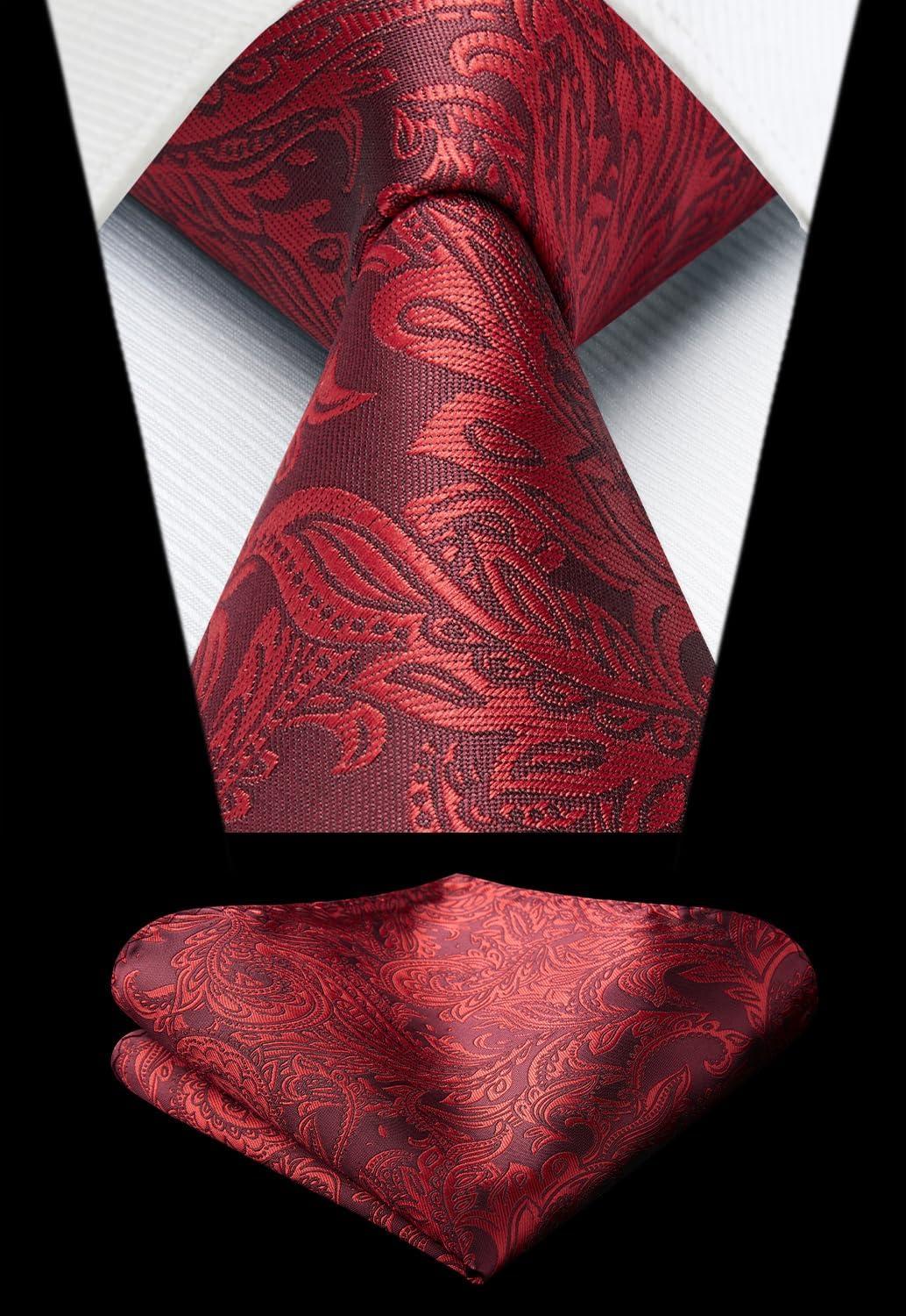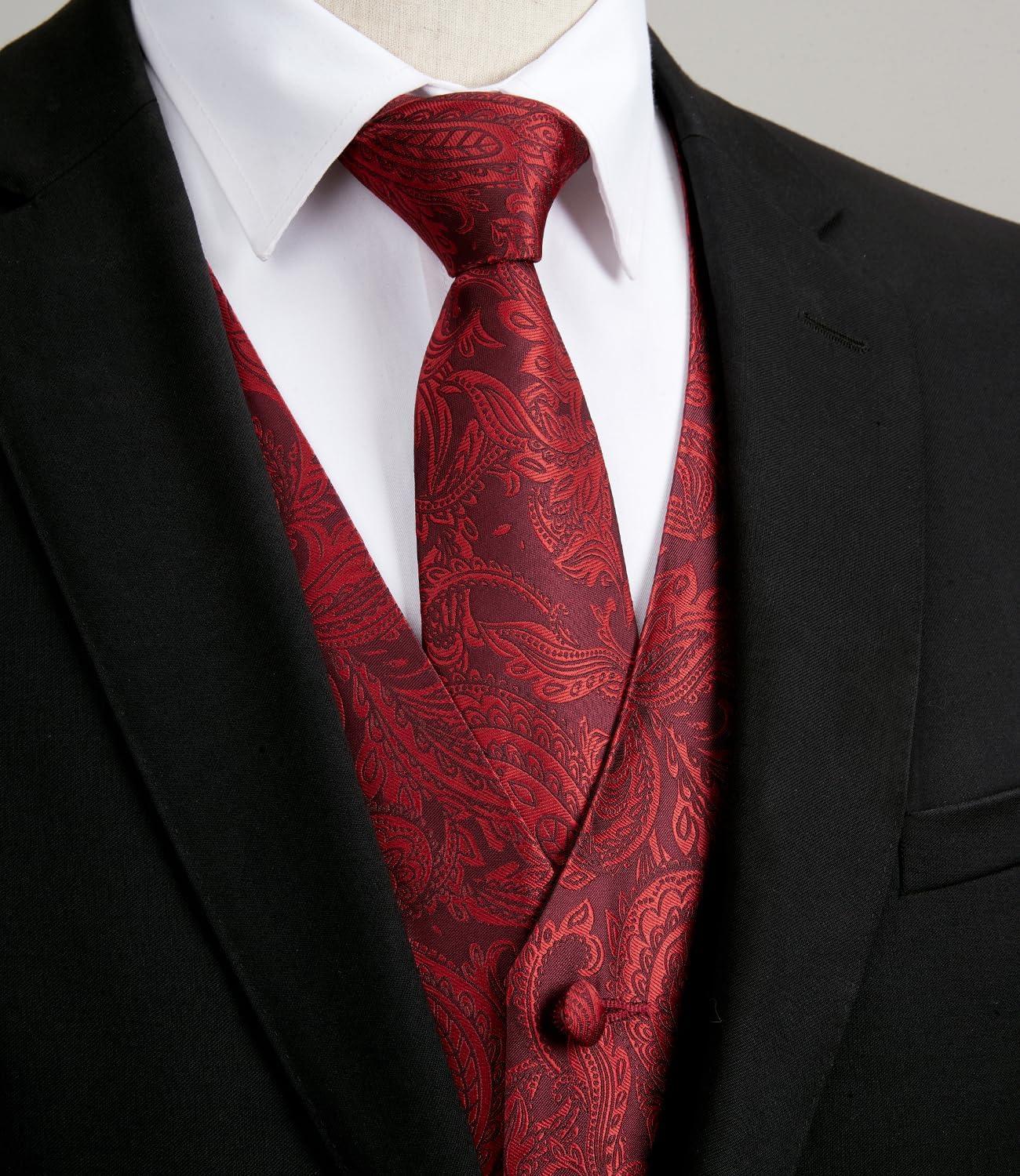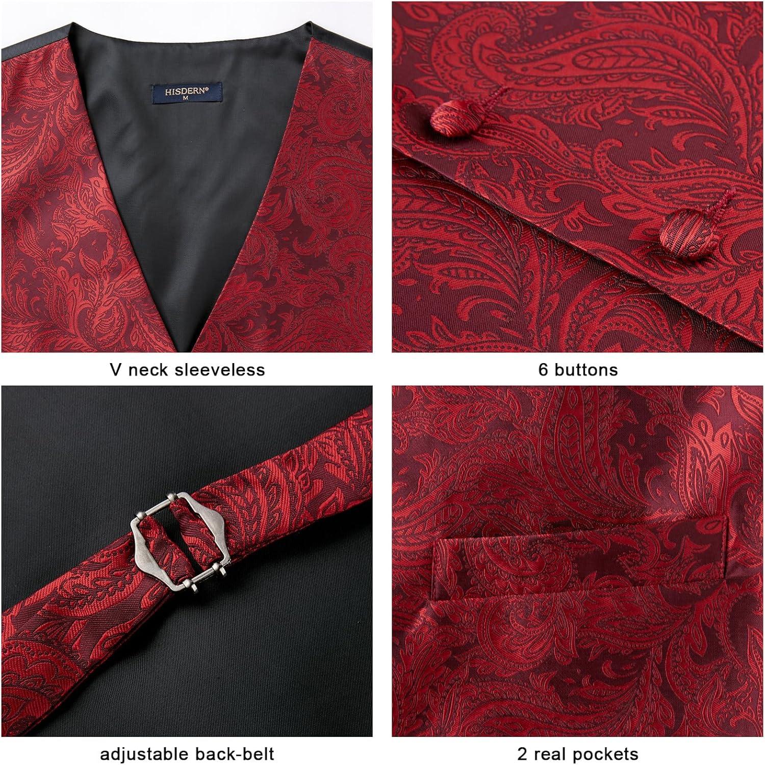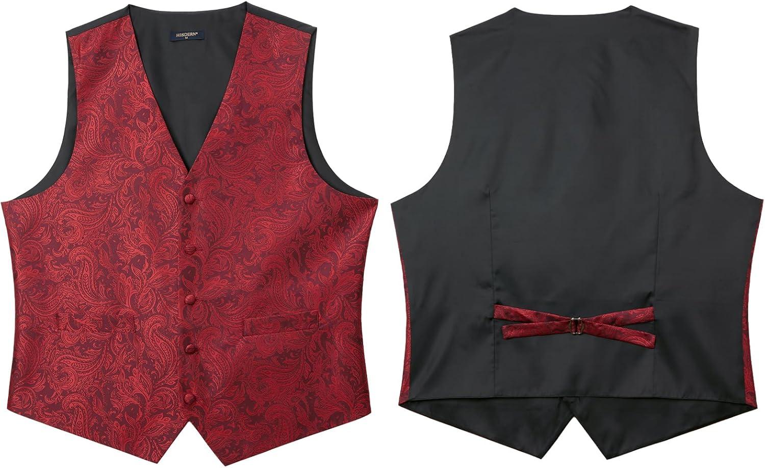 HISDERN V3-01 Men’s 3PCS Formal Vest Set Slim Fit Jacquard Waistcoat with Paisley Floral Pattern for Wedding Prom Party(Red/N2)