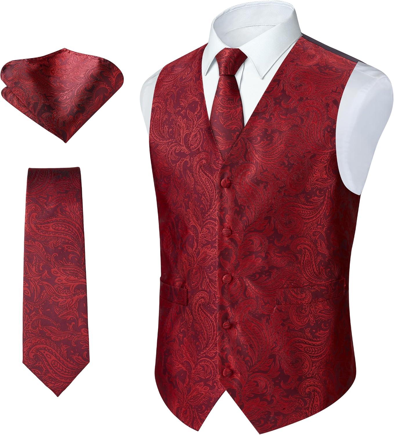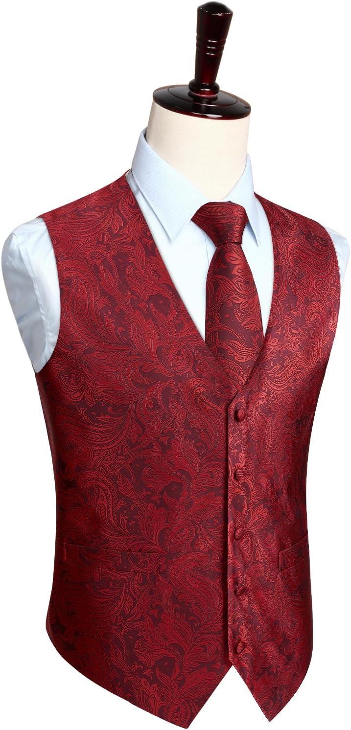 Experience elegance with Men's Suit Vest. The suit vest is a crafted blend of silk and polyester, providing a luxurious sheen and a comfortable feel. It stands for quality, durability and a touch of elegance. These vest sizes are not the same as the US size. Please check the size chart carefully on the product picture instead of the Amazon size chart.10 optional size; Tie Width: 3.4 inches & Tie Length: 59 inches; Handkerchief size: 12 inches x 12 inches.The paisley jacquard pattern is a timeless design that adds a level of sophistication to any outfit. The vibrant solid color are suitable to make you stand out in the crowd. V neck, 2 pockets,5 button front, and features an adjuster strap in the back to take in or let out for a proper fit.This 3 piece set includes a suit vest, necktie, and pocket square. They can be paired with shirts, suits, tuxedos, and even jeans to create an Eye-Catching outfit for any occasion.Whether it's a Wedding, Graduation, prom, Party, Show or formal meeting, Office, Working, this suit vest set is your go-to choice. It’s a Surprise present for Father's Day, wedding, birthday, Christmas, Halloween, and Thanksgiving Day.