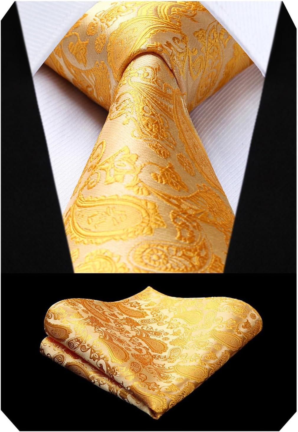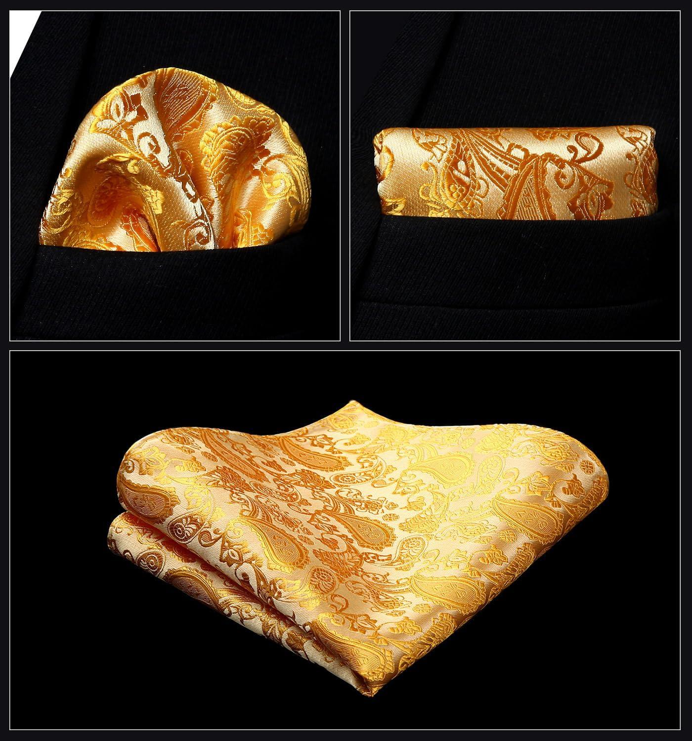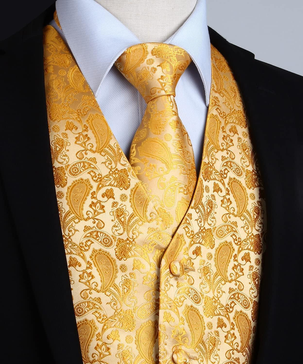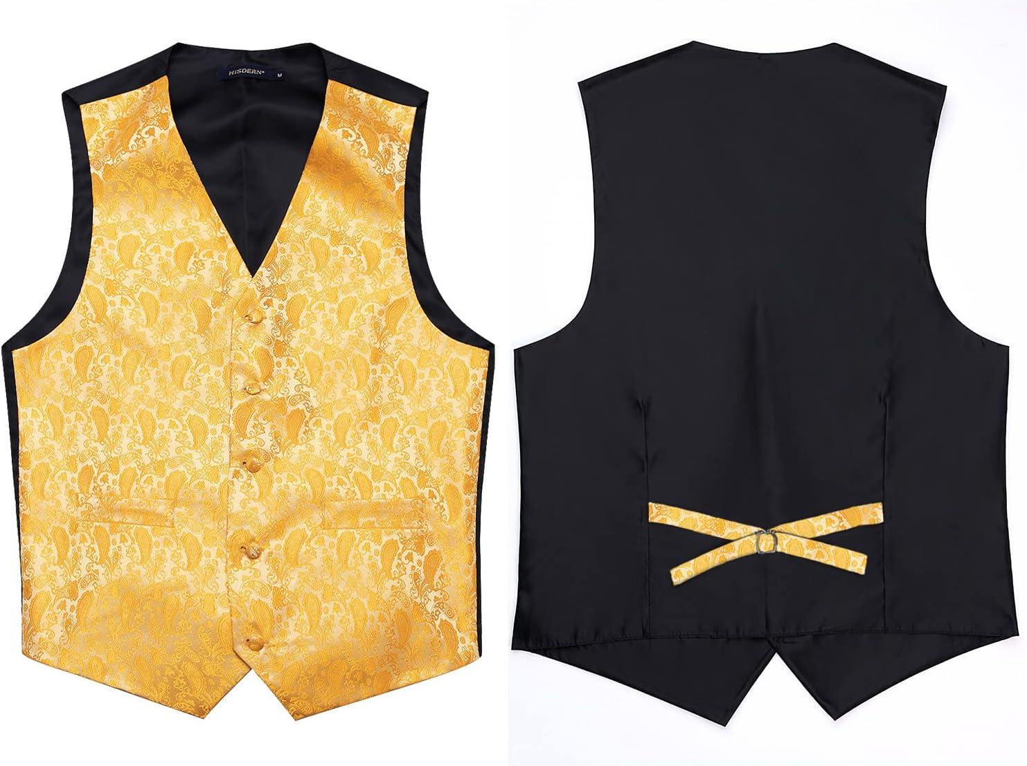 HISDERN V3-01 Men’s 3PCS Formal Vest Set Slim Fit Jacquard Waistcoat with Paisley Floral Pattern for Wedding Prom Party(Yellow/N)